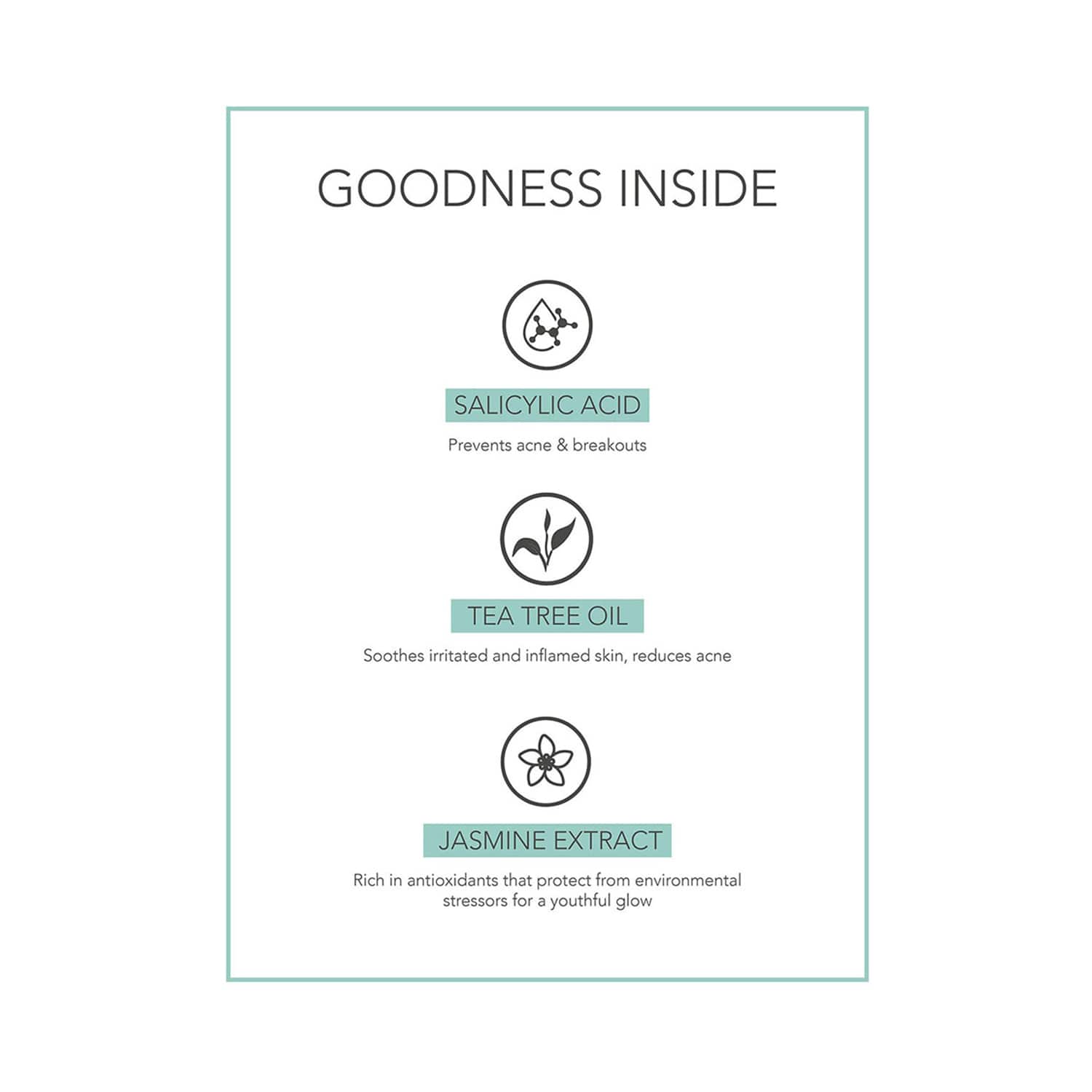 Key Ingredients:Salicylic acid: Prevents acneTea tree oil: Soothes irritations and inflammation on skinJasmine extract: Protects from stressors in the environment giving younger-looking skin