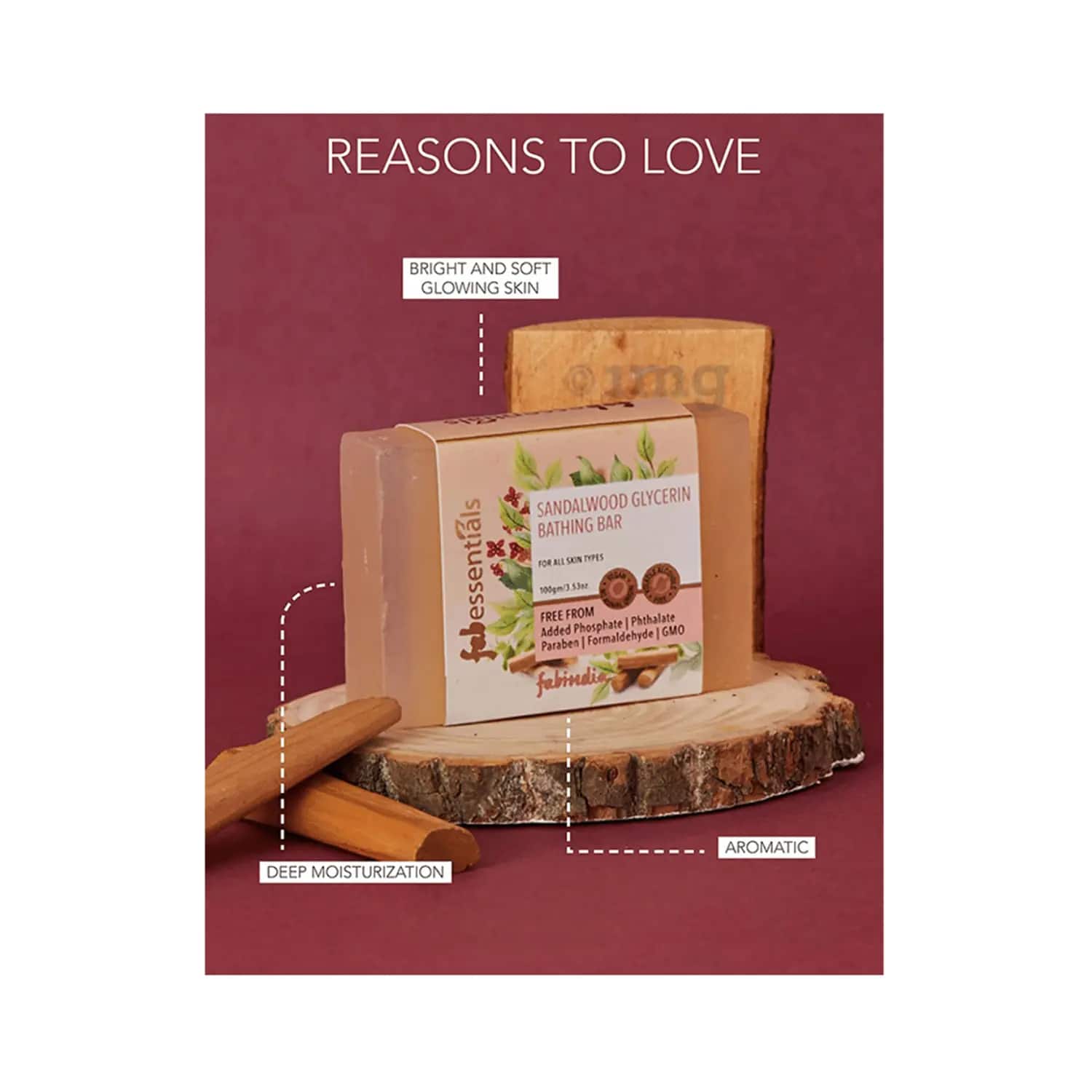 Be at one with your body and mind using the Fabessentials Sandalwood Glycerine Bathing Bar (100g). This healthy, nourishing bathing bar relaxes and calms the skin. With its healing properties, this glycerin bathing bar hydrates your skin thoroughly. This is a moisturizing bathing bar that protects your skin from UV rays and other pollutants, making this Fabessentials bathing bar essential in the shower.Key Features & Benefits:Brightens skin tone and gives it a natural glowRich in antioxidants and vitamins to protect from and reverse sun damageMade of glycerin for thorough hydrationCruelty-free and natural for safe and guilt-free useKey Ingredients:Sandalwood: Brightens skin toneGlycerin: Locks in moisture and hydrates skinAll Ingredients:Purified Water, Sodium Cocoate, Propylene Glycol, Sodium Stearate, Sodium Laureth Sulfate, Polysaccharide/ Polyhydric Alcohols, Glycerin, Sodium Lauryl Sulfate, Sodium Chloride, Sodium Gluconate, Tetrasodium Edta, Disodium Etidronate, Perfume, Santalum Album (Sandalwood) Extract.How to Use:Wet your body. Apply the soap gently to lather. Rinse off well after use.About the Brand:Founded by John Bissell in 1960 in New Delhi, India, Fabindia has been renowned for its wide range of naturally made-traditional products. It started a personal care range called Fabessentials in 2021, including haircare, skincare, body care, bath, and aromatherapy. Products from Fabessentials contain natural ingredients such as turmeric, cocoa butter, sandalwood, Vitamin E, and saffron, devoid of toxins and dangerous chemicals. The USP of the brand is that it provides gentle nourishment and promotes well-being at an affordable price. It has an extensive range that consists of over 80 product categories. The brand addresses the issue of not paying attention to self-care due to today's hectic lifestyles. The range offers standardized products which are suitable for all skin types.Check out more Fabessentials by Fabindia Soaps options here, or browse through tokocart's full range of Soaps from top global brands.You can also explore other products from the world of Fabessentials by Fabindia here on tokocart.