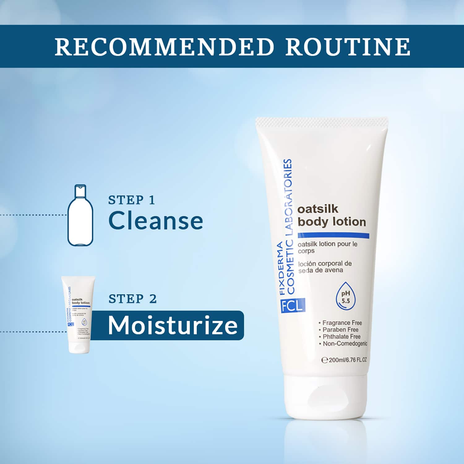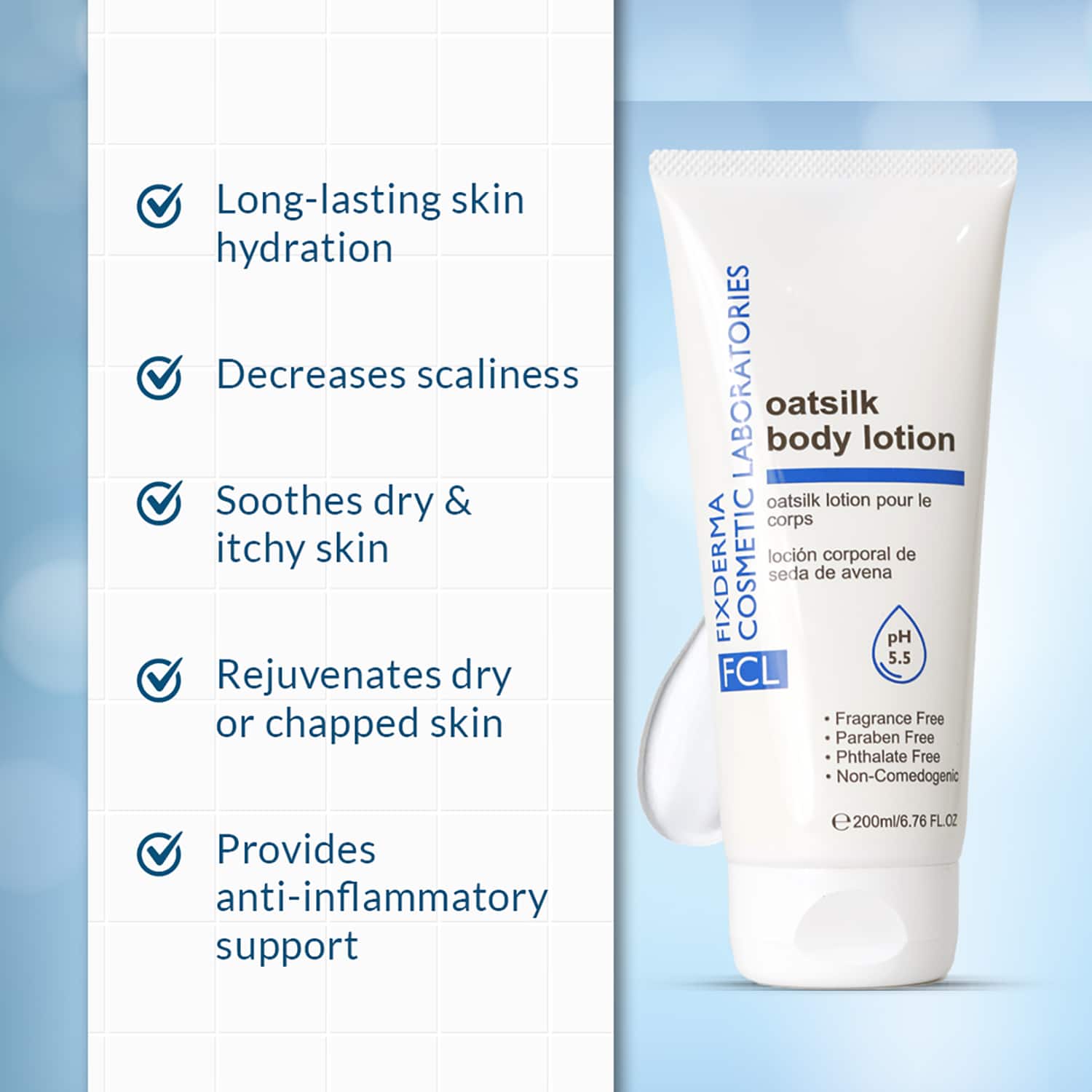 Formulated with the Triple Oat Complex, Shea butter Linolenic acid & Sodium PCA to relieve and soothe skin while moisturizing for 24 hours to provide lasting protection and skin hydration. It employs EcoCert/ Cosmos certified organic version of colloidal oat meal which is completely sterile and free from irritants. KEY INGREDIENTS: Dry & Itchy dry skin Psoriasis Seborrheic dermatitis Keratosis pilaris Atopic dermatitis Red, bumpy and scaly skin condition INDICATIONS: Psoriasis Seborrheic dermatitis Keratosis pilaris Atopic dermatitis Itchy dry skin. Red, itchy, bumpy and scaly skin condition. DIRECTIONS FOR USE Apply a sufficient amount onto skin after shower or bath. Apply twice daily Why We Are Different? Eco Cert/Cosmos (US) certified Colloidal Oatmeal organic version Offers long lasting skin hydration Decreases scaliness & maintains the surface acid mantle. Suitable for all skin types Non-greasy & non-comedogenic formulationKey Features & BenefitsSOOTHING & MOISTURIZING: Formulated with the Triple Oat Complex, Shea butter Linolenic acid & Sodium PCA to relieve and soothe skin while moisturizing for 24 hours to provide lasting protection and skin hydrationCERTIFIED FORMULATION: ECOCERT/COSMOS (US) certified colloidal oatmeal organic versionSUITABLE FOR ALL SKIN TYPES: Suits combination, dry, oily and normal skinKEY INGREDIENTS: Colloidal Oat Complex (Oatsilk), Shea butter, Linoleic acid, Sodium PCADIRECTIONS FOR USE: Apply a sufficient amount onto skin after shower or bath. Massage gently till it gets absorbed. For the best results, use twice a day AM & PMKey Ingredients:Oatmeal, shea butter, and linoleic acid: Hydrate and nourish skinAll Ingredients:Aqua, Glycerol, Shea Butter Ethyl Esters, Octyl Stearate, Isopropyl Myristate, Avena Sativa (Oat) Meal Extract, Cetearyl Alcohol, Ceteareth-20, Polyglyceryl-6 Distearate, Jojoba Esters, Polyglyceryl-3 Beeswax, Cetyl Alcohol, Myristyl Myristate, Squalane, Caprylhydroxamic Acid, Caprylyl Glycol, Glycerin, Linoleic Acid, Linolenic Acid, Sodium Pca, Xanthan Gum, Fragrance.How to Use:Wash your skin. Take a bit of the lotion and put it on your skin. After that, massage well for increased hydration. Apply twice daily for the best results.About the Brand:Fixderma is a leading cosmetics company founded in 2006 with an innovative vision in skin care. They work efficiently in this field, gradually establishing themselves as a well-known manufacturer and supplier of cosmetics worldwide. The brand focuses on manufacturing, marketing, and promoting innovative dermatology products in India and exports them to over 30 countries worldwide. Fixderma has made a name for itself by producing high-quality, results-oriented products that have made a distinct difference to the skin care products on the market.Check out more Fixderma Body Lotions & Moisturisers options here, or browse through tokocart's full range of Body Lotions & Moisturisers from top global brands.You can also explore other products from the world of Fixderma here on tokocart.