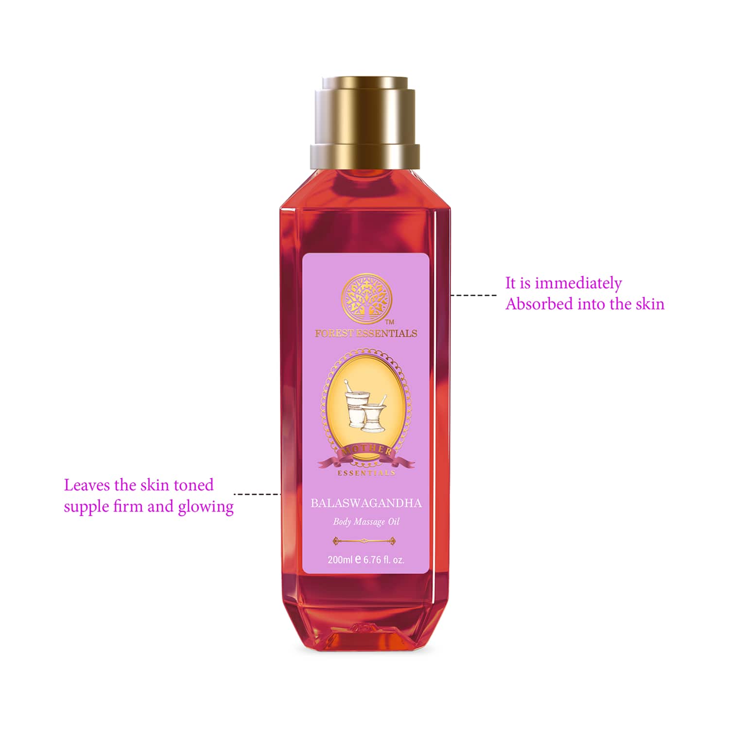 Upgrade your self-care regime with the Forest Essentials Balaswagandhadi Mother's Body Massage Oil (200ml). This nourishing oil contains licorice extract, vitamin E, and black sesame oil, which help improve the elasticity of the skin. It quickly gets absorbed into the skin to induce a radiant glow while reducing inflammation. Plus, this Forest Essentials oil is chemical-free, so you can use it on your body worry-free.Key Features & Benefits:Contains licorice, vitamin E, and black sesame oil to give your skin a glowHelps improve skin elasticityMakes skin soft and suppleAbsorbs quickly into skin after applicationKey Ingredients:Licorice, vitamin E, and black sesame oil: Nourish and soften skinAll Ingredients:Virgin Coconut Oil (Cocos Nucifera) - 30.0%, Castor Oil (Ricinus Communis) - 4.0%, Bala Root Extract (Sida Cordifolia) - 2.0%, Sandalwood Extract (Santalum Album) - 2.0%, Anantmool Root Extract(Hemidesmus Indicus) - 2.0%, Nagarmotha Root Extract (Cyperus Rotundus) - 2.0%, Tulsi Leaf Extract (Ocimum Sanctum)- 2.0%, Padmak Bark Extract (Prunus Puddum) - 2.0%, Ashwagandha Root Extract (Withania Somnifera)- 2.0%, Vetiver Root Extract (Vetiveria Zizanioides) - 2.0%, Durva Root Extract (Cynodon Dactylon)- 1.0%, Rasna Leaf Extract (Pluchea Lanceolata) - 1.0%, Sparrow Grass Root Extract (Asparagus Racemosus) - 1.0%, Liquorice Root Extract(Glycyrrhiza Glabra) - 1.0%, Ginger Essential Oil(Zingiber Officinale) - 0.5% Base Contains Sweet Almond Oil (Prunus Amygdalus Dulcis ), Mustard Oil (Brassica Juncea), Sunflower Oil (Helianthus Annuus), Dahi Mastu, Vitamin E (Tocopheryl Acetate) - Q.S.How to Use:First, cleanse your skin and pat dry with a soft towel. Then, apply the oil to your skin and massage using your fingertips until it absorbs completely.About the Brand:Established in 2000 by Mira Kulkarni in New Delhi, India, Forest Essentials is an authentic and traditional skin and hair care brand. They create formulas rooted in the ancient science of Ayurveda. The quintessential beauty brand combines the ancient beauty rituals of Ayurveda with a stylish, modern aesthetic to deliver highly effective products to its consumers. They believe that beauty products made out of living substances, such as plants and their extracts, are balanced by nature and possess the vibratory energy that makes up life. All of their products, from kajals, shampoos, conditioners, body mists, serums, and cheek tints, to baby powder, contain all the purifying, nourishing, and balancing properties necessary to nurture the skin and for eternal beauty.Check out more Forest Essentials Massage Oil options here, or browse through tokocart's full range of Massage Oil from top global brands.You can also explore other products from the world of Forest Essentials here on tokocart.
