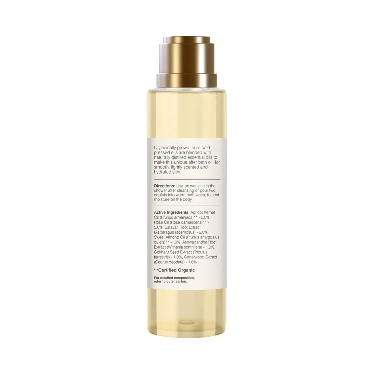 All Ingredients:Apricot Kernel Oil (Prunus Armeniaca) - 5.0%, Rose Oil (Rosa Damascena) - 5.0%, Shatavari Root Extract (Asparagus Racemosus) - 2.0%, Sweet Almond Oil (Prunus Amygdalus Dulcis) - 1.0%, Ashwagandha Extract (Withania Somnifera) - 1.0%, Gokhru Seed Extract (Tribulus Terrestris) - 1.0%, Cedarwood Extract (Cedrus Deodara) - 1.0%. Base Contains Sunflower Seed Oil (Helianthus Annuus), Olive Oil (Olea Europaea), Avocado Oil (Persea Gratissima), Castor Oil (Ricinus Communis), Vitamin E (Tocopheryl Acetate) - Q.S.