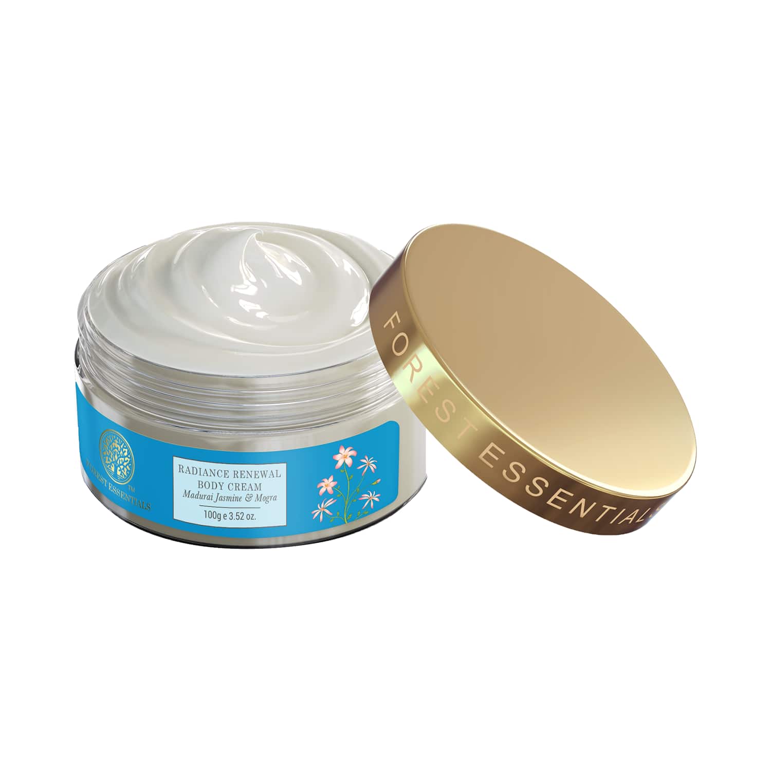 Unlock the secret to supple skin with the Forest Essentials Madurai Jasmine & Mogra Radiance Renewal Body Cream (100g). This conditioning body cream is infused with jasmine and mogra essential oils to soothe the skin and exude an uplifting fragrance. Also, the Forest Essentials body cream is free from harmful chemicals to ensure risk-free use.Key Features & Benefits:Infused with shea butter to protect the skin from environmental damageEnriched with wheat germ oil to repair damaged skinContains sweet almond oil to moisturize the skin and add a natural glowFree from parabens, petrochemicals, and chemicals for safe useKey Ingredients:Shea butter: Safeguards the skin from environmental damageWheat germ oil: Repairs damaged skinSweet almond oil: Moisturizes the skinAll Ingredients:Sweet Almond Oil Moringa O Wheatgerm Oil, Sesame Seed Oil Olive Fruit Oil, Bala Root Extract, Fresh Aloe Vera Leaf Extract, Manjistha Root Extract, Cocoa Seed Butter, Mixed Tocopherol, Mogra Flower Infusion, Jasmine Flower OilHow to Use:After bathing, apply the body cream all over your body and massage it into your skin using slow, circular movements.About the Brand:Established in 2000 by Mira Kulkarni in New Delhi, India, Forest Essentials is an authentic and traditional skin and hair care brand. They create formulas rooted in the ancient science of Ayurveda. The quintessential beauty brand combines the ancient beauty rituals of Ayurveda with a stylish, modern aesthetic to deliver highly effective products to its consumers. They believe that beauty products made out of living substances, such as plants and their extracts, are balanced by nature and possess the vibratory energy that makes up life. All of their products, from kajals, shampoos, conditioners, body mists, serums, and cheek tints, to baby powder, contain all the purifying, nourishing, and balancing properties necessary to nurture the skin and for eternal beauty.Check out more Forest Essentials Body Lotions & Moisturisers options here, or browse through tokocart's full range of Body Lotions & Moisturisers from top global brands.You can also explore other products from the world of Forest Essentials here on tokocart.