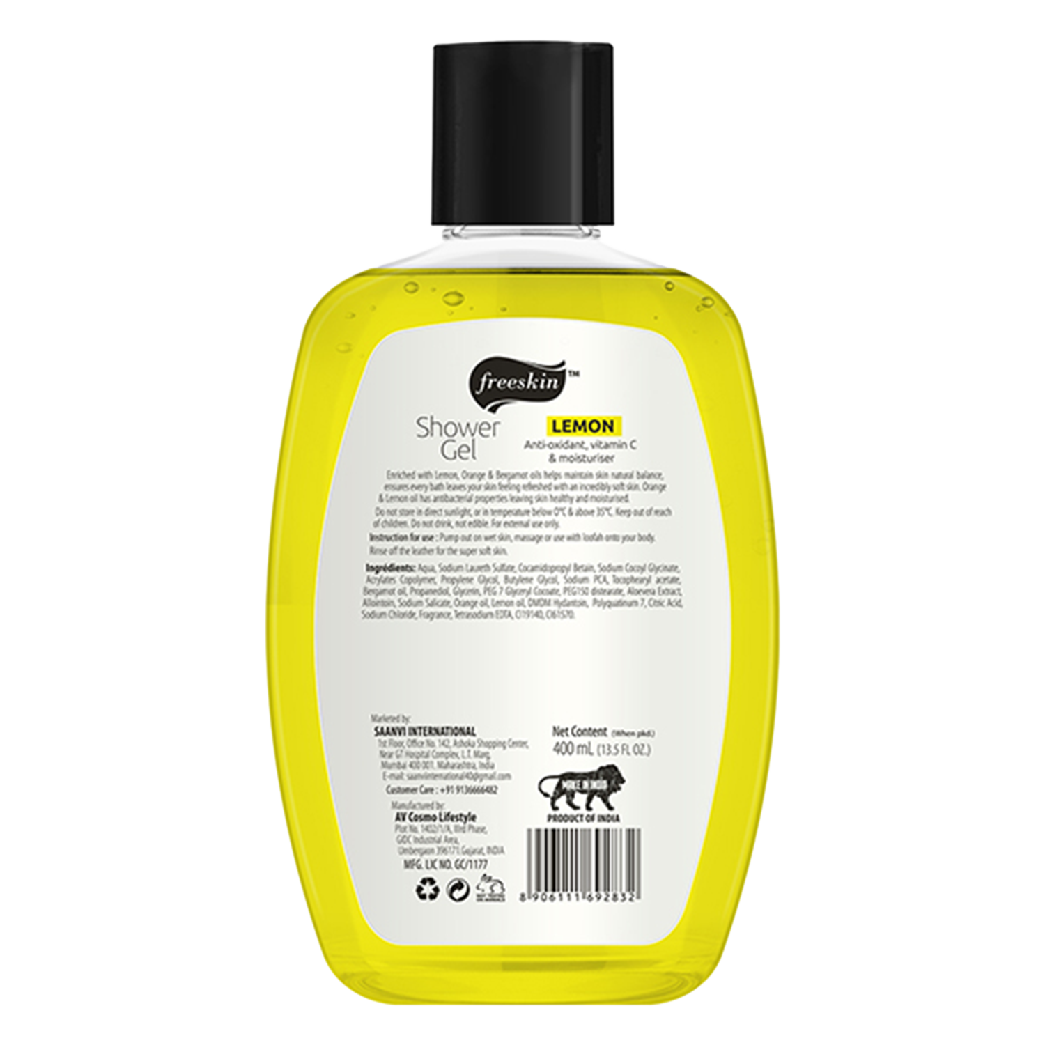 Pamper your skin during showers with the Freeskin Lemon Moisturizing Shower Gel - (400ml). Each bath with this hydrating shower gel leaves your skin refreshed and incredibly soft. It is enriched with lemon, orange, and aloe vera to help maintain the skin's natural balance. Orange and lemon essential oils have antibacterial properties that keep skin healthy and moisturised.Enriched with lemon, orange, and aloe vera to detoxify and cleanse the skinRefreshing bath and shower gel suitable for everyday useHelps to stimulate blood circulation and soothes dry skinMinimises skin pores and reduces skin inflammationCruelty- and paraben-free shower gel is safe for useAloe vera: Moisturises and soothes skinLemon: Gets rid of dead skin cellsOrange oil: Nourishes the skinPour an adequate amount of shower gel on your palms and work gently to create a rich lather. You can also use a loofah to cleanse as well as exfoliate your skin.Freeskin is a beauty brand that specialises in creating skincare products that cater to every individual's need. The brand formulates the best skincare products, incorporating natural skin-soothing ingredients to nurture every skin type. Freeskin presents a wide range of products, from hand washes to shower gels and scrubs. They use a variety of natural ingredients which are effective for the skin and are dermatologically tested. All the products are cruelty-free and contain no paraben, silicone, or mineral oil to suit all skin types.Check out more Freeskin Body Wash & Shower Gel options here, or browse through tokocart's full range of Body Wash & Shower Gel from top global brands.You can also explore other products from the world of Freeskin here on tokocart.