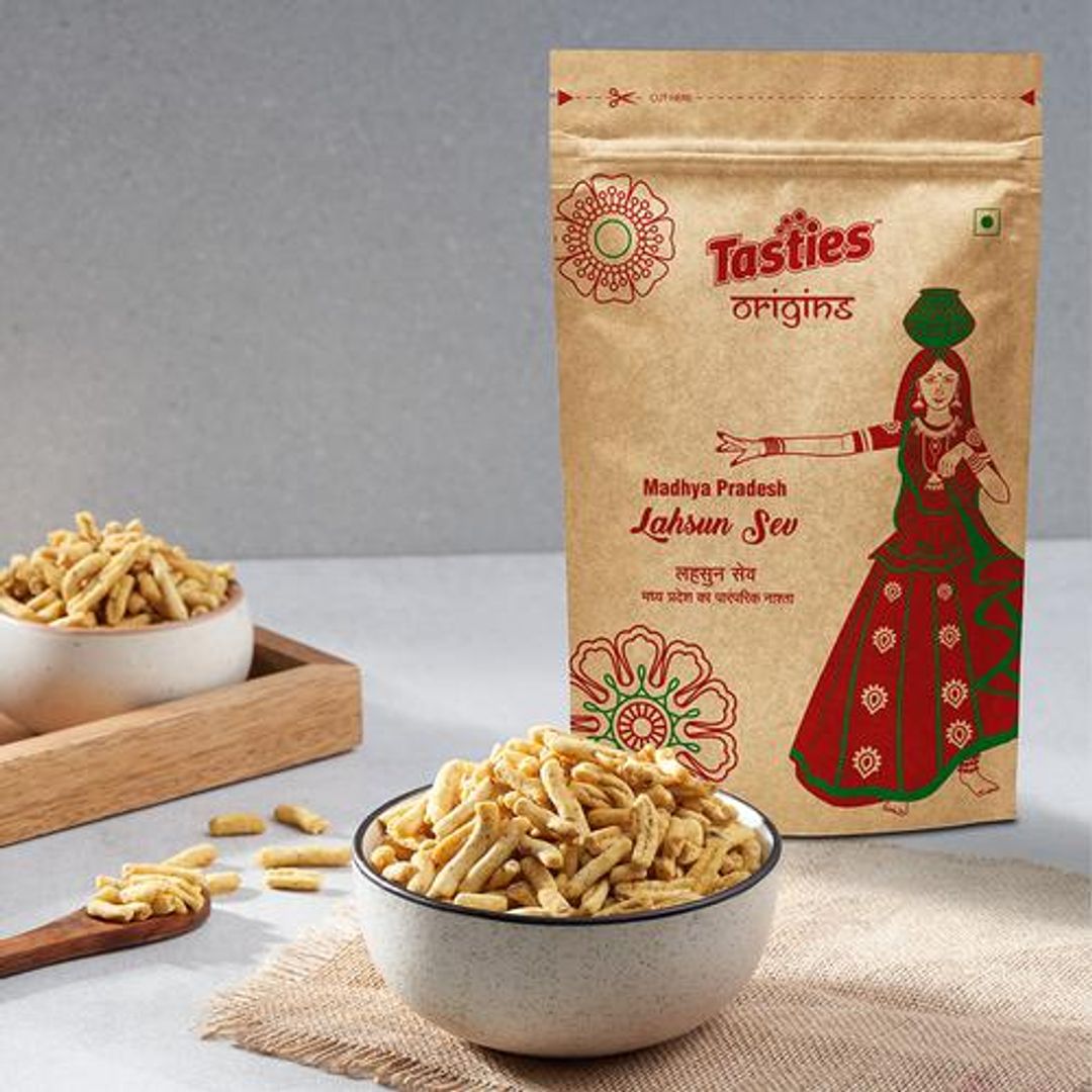 About the ProductA savoury blend of crispy and flavourful snacks the Namkeen - Lahsun Sev/Garlic Sev, Indori Style, Teatime Snack is a unique blend of local herbs and spices and creates a distinct flavour that you are gonna love! This teatime treat is the ideal snack and can be enjoyed with your evening cuppa or fresh juice and is a guilt-free indulgence that you can relish at any time of the day. The Namkeen - Lahsun Sev/Garlic Sev, Indori Style, is made with all-natural ingredients and is the ultimate snack to revel in with your friends and family. Processed with fine gram pulse flour and fresh spices, this teatime spicy snack is the refreshment you need after a long day! A delectable packet of this Teatime Snack is the perfect accompaniment with your favourite cup of tea and is sourced from traditional Madhya Pradesh homes to give you an energy boost at any time of the day. A timeless chai-nashta snack, the Namkeen - Lahsun Sev/Garlic Sev, Indori Style, has fibre and no added preservatives and brings the freshness of Indian tradition in one go. This Tasties Origin Snack is a must-have in your pantry and brings you all the goodness a light snack can offer! Experiment with the eclectic range of Tasties Origin's Namkeen collections on Big Basket from Lahsun Sev, Indori Mixture, and more, where tradition meets flavour in local recipes.