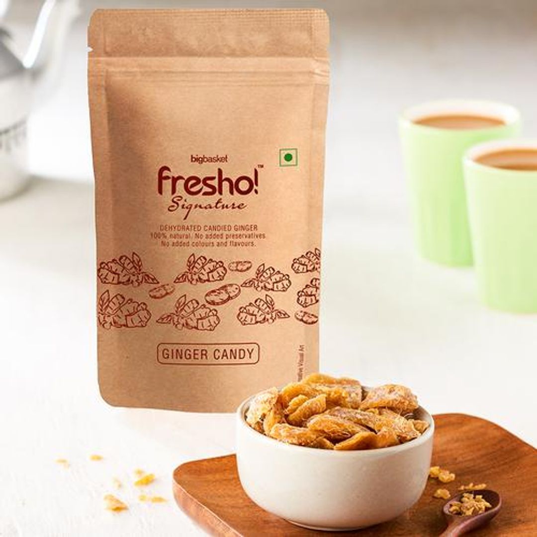About the ProductFresho Signature presents an array of dry fruits apart from the ordinary to give you the best of the best to indulge. Want to try something other than a regular fruit? This sweetened ginger candy is healthy. It contains ginger and sulphurless sugar. Easy to carry, it makes a great snack to keep you going throughout the day. Our candied ginger is here to be your snack buddy and your healthy sugar high. They are sweetened with sulphurless sugar and liquid glucose to enhance the zing. There are 0 added preservatives, artificial colour and flavour to retain the original fruit essence and keep it natural and healthy.