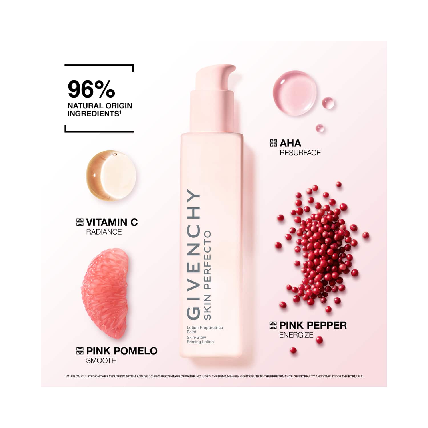 For an illuminating complexion, use the Givenchy Skin Perfecto Lotion (200ml). This hydrating lotion is infused with potent vitamin C and AHAs that offer a gentle peeling action to revitalize your skin. Also, this Givenchy anti-aging lotion is enriched with pink pepper and pink pomelo to balance and moisturize while creating a skin barrier to protect from external factors.
