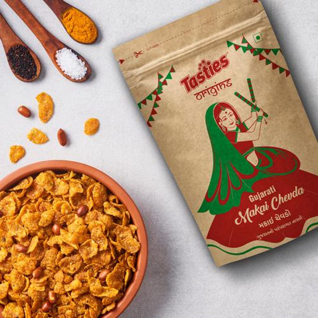 About the ProductA delicious and crunchy snack perfect for any occasion our Namkeen Makai Chevda/Cornflakes Mixture - Gujarati Style is the snack you need to enjoy on the go and comes with a satisfying crunch that will leave you wanting for more. Made with a fresh combination of cornflakes, flavourful chana dal and other spices, our treat is held down by tradition and is freshly made with local Gujarati recipes. A traditional recipe that you can revel in at any time of the day, Namkeen Makai Chevda is a healthy snack for people of all ages and serves you essential nutrients to make sure that you can snack on treats guilt-free. A natural fibre and energy booster, our savoury snack is best accompanied by any beverage of your choice and is ready to eat. Our Namkeen Makai Chevda has no added preservatives and no cholesterol and is the perfect snack to have in your pantry. Indulge in savour goodness with our Namkeen Makai Chevda/Cornflakes Mixture - Gujarati Style now! Experiment with the eclectic range of Tasties Origin's Namkeen collections on Big Basket from Lahsun Sev, Indori Mixture, and more, where tradition meets flavour in local recipes.