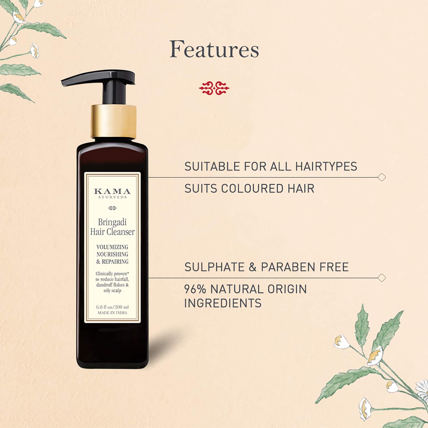 Start your day with a deep-pampering hair wash with the Kama Ayurveda Bringadi Hair Cleanser (200ml). Made with indigo extract, licorice extract, amla, and bhringraj, this volumizing hair cleanser nourishes and repairs your hair while imparting a new volume. It helps prevent loss by conditioning strands and keeping them smooth. And since this Kama Ayurveda hair cleanser is paraben-free, you can rest assured that your locks are safe from harmful chemicals.Key Features & Benefits:Contains indigo, licorice, and amla that nourish your hairHelps in boosting the volume of your hairAnti-hair fall formula helps prevent fallingParaben-free cleanser ensures safe useKey Ingredients:Amla, indigo extract, and bhringraj: Nourish and repair hairAll Ingredients:Aqua, Lauryl Glucoside, Disodium Cocoyl Glutamate, Sodium Cocoamphoacetate, Glycerine, Betaine, Sodium Pca, Pca Glyceryl Oleate, Hydrolyzed Soy Protein, Hydrolyzed Vegetable Protein, Sodium Benzoate, Potassium Sorbate, Lavandula Hybrida (Lavender) Oil, Rosmarinus Officinalis (Rosemary) Leaf Oil, Xanthan Gum, D Panthenol, Phyllanthus Emblica Fruit Extract, Indigofera Tinctoria (Indigo)Extract, Glycyrrhiza Glabra (Liquorice) Root Extract, Eclipta Alba Leaf Extract, Citric AcidHow to Use:First, wet your hair thoroughly. Then, squeeze the required amount of hair cleanser on your palm and create a lather by rubbing your hands together. Next, apply the lathered cleanser on your scalp generously. Last, rinse your hair with water and follow by using a conditioner.About the Brand:Launched in 2002, Kama Ayurveda has been a sought-after Indian brand providing beauty and wellness products all over the globe. Initially, they introduced 9 Ayurvedic treatments in collaboration with the well-known Arya Vaidya Pharmacy from Coimbatore, Tamil Nadu. Over the years, Kama Ayurveda has grown and spread authentic Ayurvedic treatments worldwide. All their beauty and wellness products are manufactured with natural ingredients and efficacious formulations to provide long-term skincare results to the customers.Check out more KAMA Ayurveda Shampoo options here, or browse through tokocart's full range of Shampoo from top global brands.You can also explore other products from the world of KAMA Ayurveda here on tokocart.