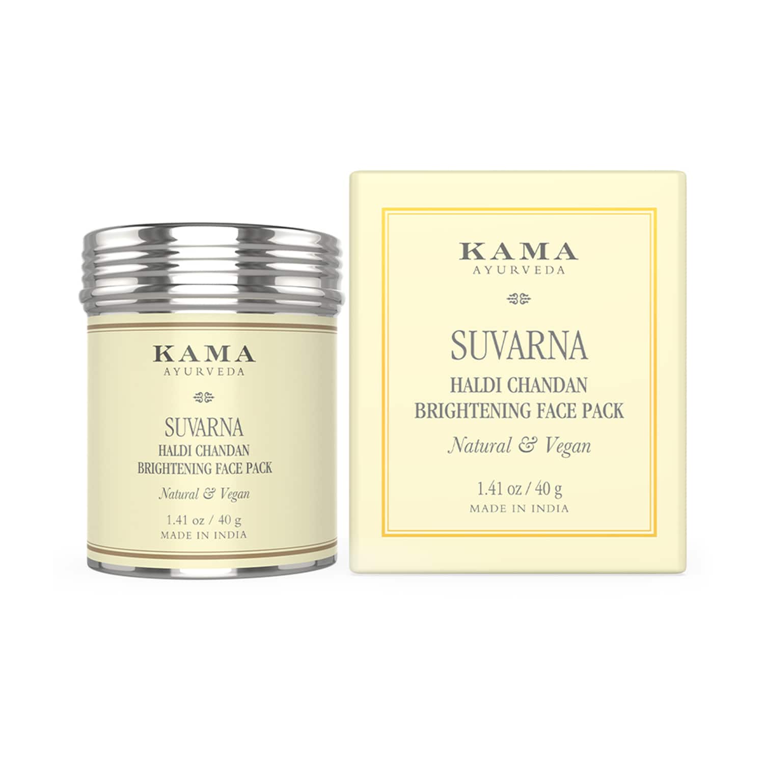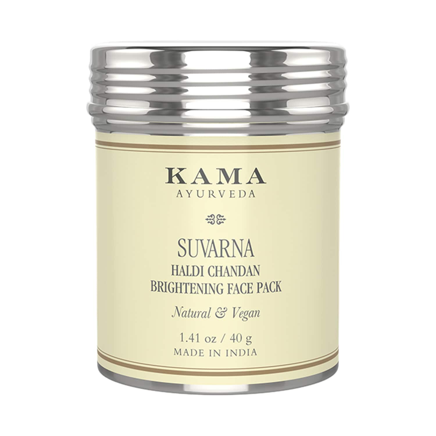 Keep your skin soft and glowing with the Kama Ayurveda Suvarna Haldi Chandan Bright Face Pack - (40g). This natural face mask purifies and brightens the skin, leaving it feeling soft, renewed, and radiant. Pure turmeric and sandalwood's brightening and toning abilities are harnessed in the face mask while multani mitti firms and mattifies skin. The moisturising mask reduces excessive sebum production, promotes healthy blood flow and skin rejuvenation, and cools the area where aggressive acne is increasing on the skin.Key Features & Benefits:Enriched with turmeric, sandalwood, and multani mitti for brightening and purifying skinAids in reducing excess sebum protection and rejuvenates the skinNatural face mask for toning the skin and makes it firmRefines pores and promotes healthy blood flowSmoothens and evens skin texture while removing impurities from the skinKey Ingredients:Turmeric oil: Provides glow and lustre to the skinSandalwood: Nourishes skinMultani mitti: Prevents dark circles and sun damageRose oil: Moisturises the skinHow to Use:Add the face mask powder to a container and make a paste. Combine 2 to 3 teaspoons with milk or yoghurt (for dry skins) or water or Kama pure rosewater (for oily skins). After making the paste apply it to damp skin. Ideally, use Kama pure rosewater to hydrate skin beforehand. Till it dries, let it work. Due to the concentrated, intense herbal flavour, tingling may happen. Use cold water to rinse. Stay away from the eyes and the surrounding region. If contact occurs, thoroughly rinse with water. This mask can be used once or twice each week.About the Brand:Launched in 2002, Kama Ayurveda has been a sought-after Indian brand providing beauty and wellness products all over the globe. Initially, they introduced 9 Ayurvedic treatments in collaboration with the well-known Arya Vaidya Pharmacy from Coimbatore, Tamil Nadu. Over the years, Kama Ayurveda has grown and spread authentic Ayurvedic treatments worldwide. All their beauty and wellness products are manufactured with natural ingredients and efficacious formulations to provide long-term skincare results to the customers.