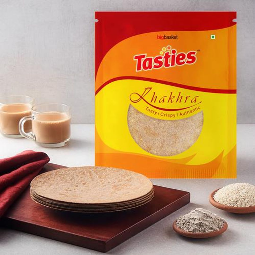 About the ProductMade from a mixture of Finger Millet, Sesame Ragi & Sesame, the Tasties Namkeen Khakhras are crunchy, delicious and absolutely fresh. This authentic Indian snack is usually served for breakfast or during tea time and can be relished guilt-free. Reach for these thin crackers that are perfectly roasted, and ease your hunger pangs without the added calories.Get ready to experience a burst of flavour with Tasties Namkeen's range of khakhras consisting multigrain, whole wheat and plain varieties.