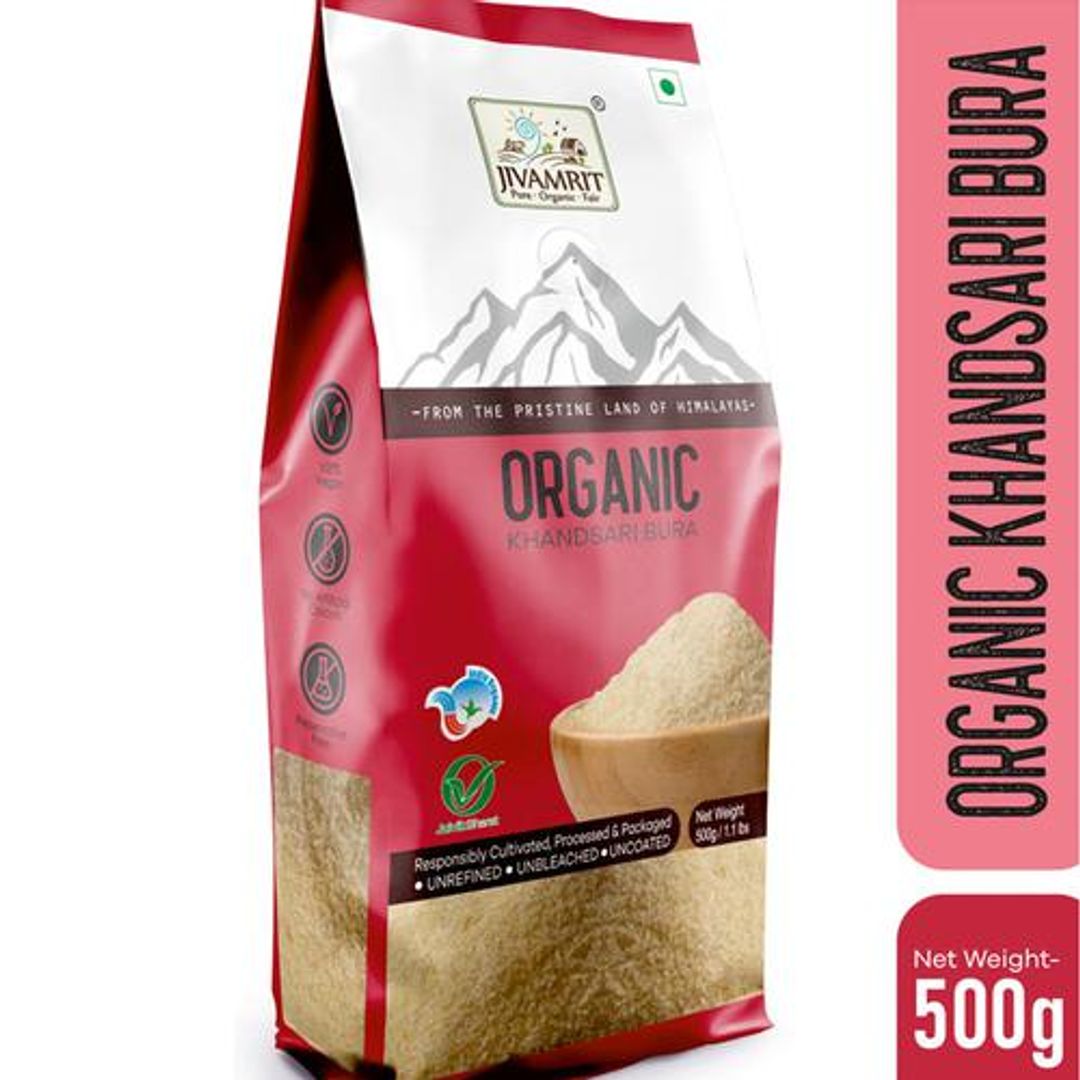 Experience the authentic sweetness of Jivamrit Organic Khandsari Bura, crafted from the juice of organically cultivated sugarcane. Created in the traditional way, this special bura is meticulously prepared in small-scale cottage units near the farms by skilled farmers who also produce jaggery. The entire process is free from chemicals, ensuring purity and natural goodness. With its characteristic brown colour when mixed with water, this unrefined khandsari bura is a testament to its organic origins and offers a delightful taste to your culinary creations.