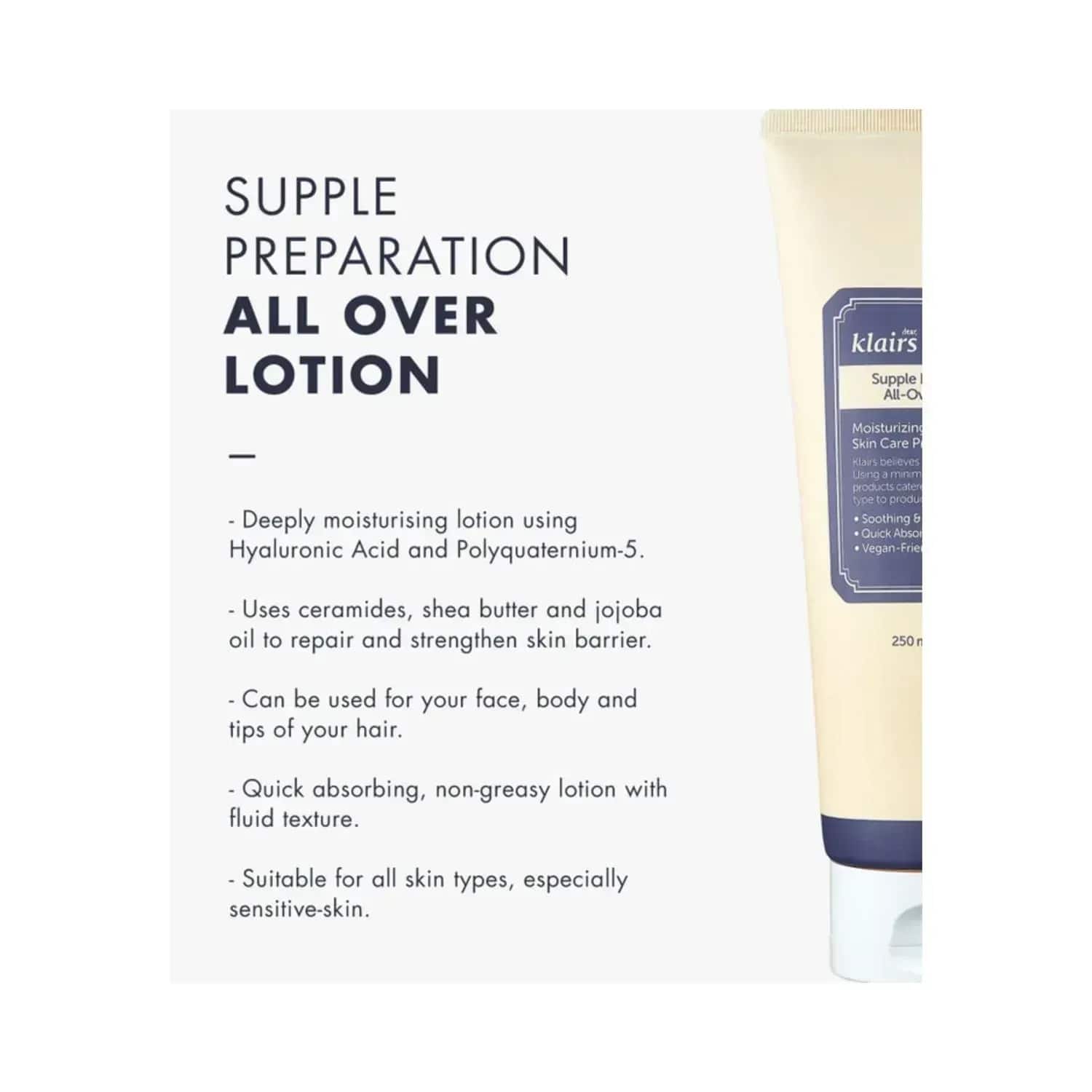 Revitalize dull and dry skin with the Klairs Supple Preparation All Over Lotion (250ml). This shea butter face lotion retains moisture in the skin and provides intense hydration. It is a skin-repairing lotion that heals damaged skin. The Klairs face lotion is also a lightweight lotion that does not leave the skin greasy.Key Features & Benefits:Enriched with jojoba oil to hydrate the skinLightweight formula ensures fast absorption into the skinNourishing face lotion strengthens skin barrierFree from ethanol and gluten for safe useKey Ingredients:Shea butter: Moisturizes the skinHyaluronic acid: Hydrates the skinAll Ingredients:Water, Glycerin, Caprylic/Capric Triglyceride, Sodium Hyaluronate, Butyrospermum Parkii (Shea Butter), Cetyl Ethylhexanoate, Simmondsia Chinensis (Jojoba) Seed Oil, Glyceryl Stearate, Sorbitan Stearate, Cetyl Alcohol, Stearic Acid, Beta-Glucan, Sorbitan Sesquioleate, Microcrystalline Wax, Cyclopentasiloxane, Betaine, Ceramide Np, Polyquaternium-51, Peg-100 Stearate, Illicium Verum(Anise) Fruit Extract, Citrus Paradisi(Grapefruit) Fruit Extract, Nelumbium Speciosum Flower Extract, Paeonia Suffruticosa Root Extract, Scutellaria Baicalensis Root Extract, Dimethicone, Tocopheryl Acetate, Chlorphenesin, Carbomer, Arginine, Citric Acid, Ethylhexylglycerin, Portulaca Oleracea Extract, Althaea Rosea Flower Extract, Aloe Barbadensis Leaf Extract, Apium Graveolens (Celery) Extract, Brassica Oleracea Capitata (Cabbage) Leaf Extract, Brassica Oleracea Italica (Broccoli) Extract, Brassica Rapa (Turnip) Leaf Extract, Daucus Carota Sativa (Carrot) Root Extract, Oryza Sativa (Rice) Bran Extract, Solanum Lycopersicum (Tomato) Fruit/Leaf/Stem Extract, Natto Gum, Centella Asiatica Extract, Disodium Edta, Lysine Hcl, Proline, Sodium Ascorbyl Phosphate, Acetyl Methionine, TheanineHow to Use:Clean your face and pat dry. Then, take the lotion and massage it on your face in a circular motion.About the Brand:Launched in 2010 in Seoul, Klairs is a renowned skin care brand that focuses on developing functional products for sensitive skin. It is a brand committed to ethical practices, being both cruelty-free and vegan. They focus on creating products using essential raw materials that meet the safety standards established by a specialized research laboratory associated with dermatologist-recommended skin care. From cleansing and moisturizing to soothing and calming the skin, Klairs provides everything.Check out more Klairs Body Lotions & Moisturisers options here, or browse through tokocart's full range of Body Lotions & Moisturisers from top global brands.You can also explore other products from the world of Klairs here on tokocart.