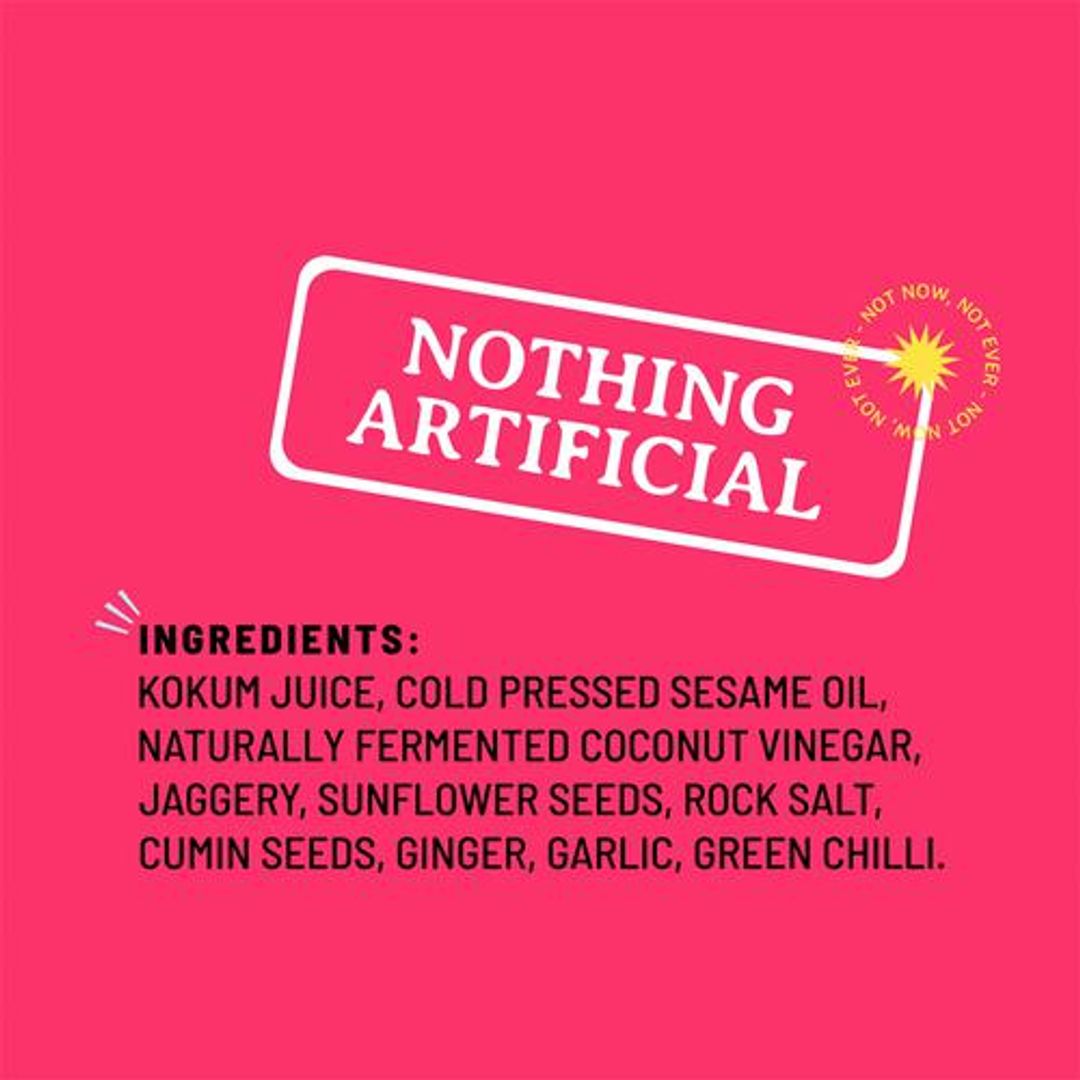 Kokum Juice, Cold Pressed Sesame Oil, Naturally Fermented Coconut Vinegar, Jaggery, Sunflower Seeds, Rock Salt, Cumin Seeds, Ginger, Garlic, and Green Chilli.