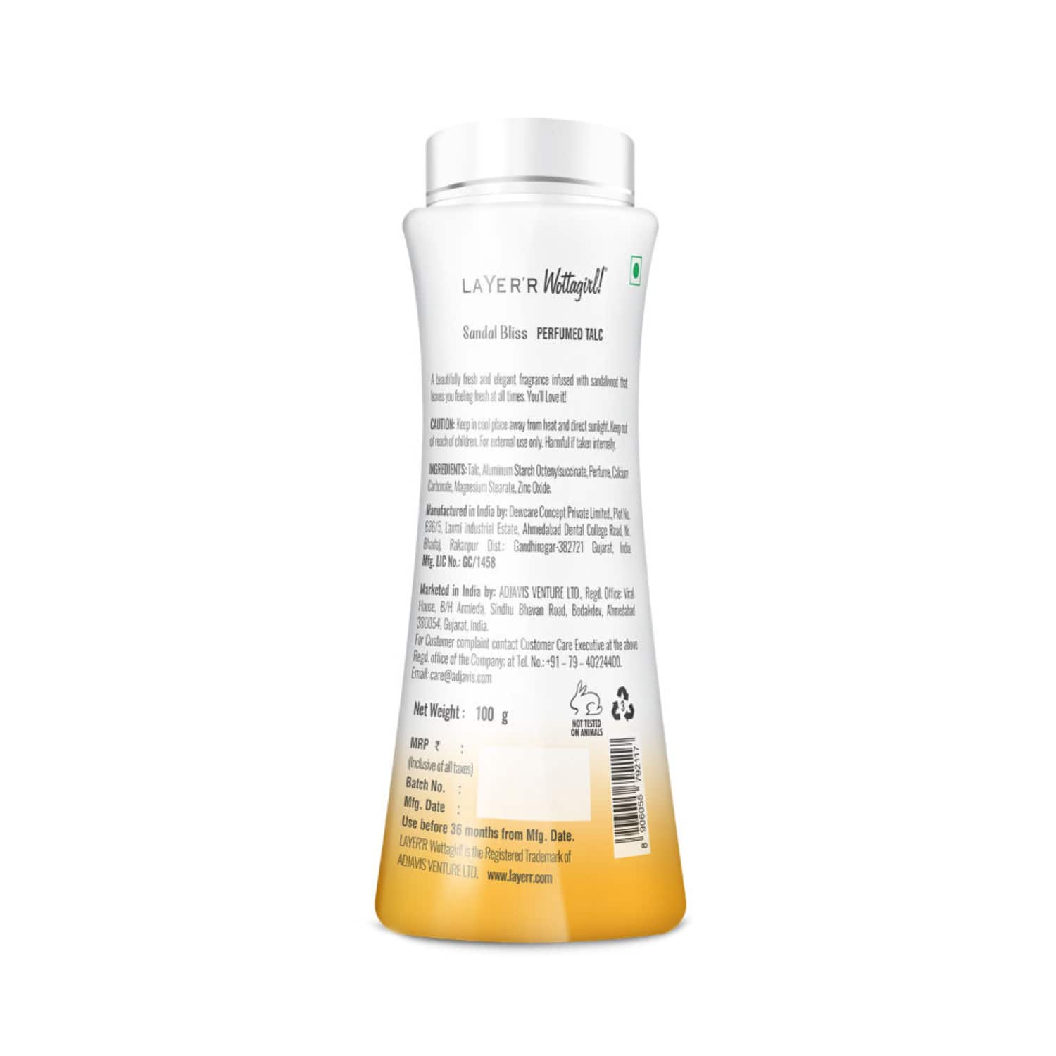 Project an air of elegance with the Layer'r Wottagirl! Sandal Bliss Perfumed Talc (100g). This refreshing talc is infused with a unique blend of rose, jasmine, and sandalwood to soothe your senses. Also, this mild talc is ideal to use on the body and face. The Layer'r Wottagirl talc smoothens your skin and leaves your skin lightly scented.Top Notes:Rose, Orange Blossom, and BergamotHeart Notes:Jasmine, Muguet, and FreesiaBase Notes:Sandalwood, Musk, and AmberKey Features & Benefits:Infused with rose, jasmine, and sandalwood for a pleasant fragranceExudes a scent of sandalwood to energize the moodGentle formula leaves your skin soft and smoothSuitable for use on the body and faceIdeal for all skin typesKey Ingredients:Sandalwood: Exudes a pleasant scentAll Ingredients:Talc, Aluminium Starch Octenylsuccinate, Perfume, Calcium Carbonate, Zinc Oxide, Magnesium Stearate, Menthol, Methyl LactateHow to Use:After bathing or showering, take some talc powder into the palm of your hand, then rub your hands together until they are coated in powder. Apply it to your skin in gentle motions.About the Brand:Founded in 2013 by Mr. Devendra N Patel, LAYER'R WOTTAGIRL is India's first body splash brand for women. They aim to create exclusive personal care products that fulfill every woman's needs and lifestyle. Their products range from body splash, fine fragrance, perfume spray, facewash, and body lotion to talc and shower gel for women. They offer products with extremely captivating aromas spinning romance, enigma, and femininity.Check out more Layer'r Talc options here, or browse through tokocart's full range of Talc from top global brands.You can also explore other products from the world of Layer'r here on tokocart.