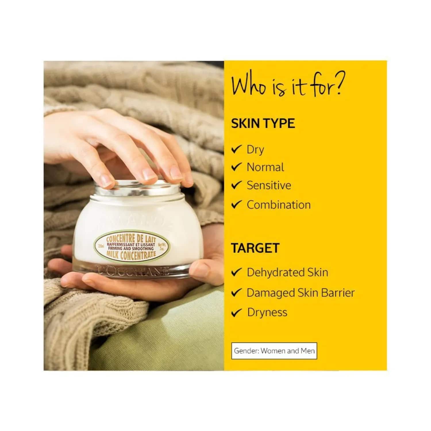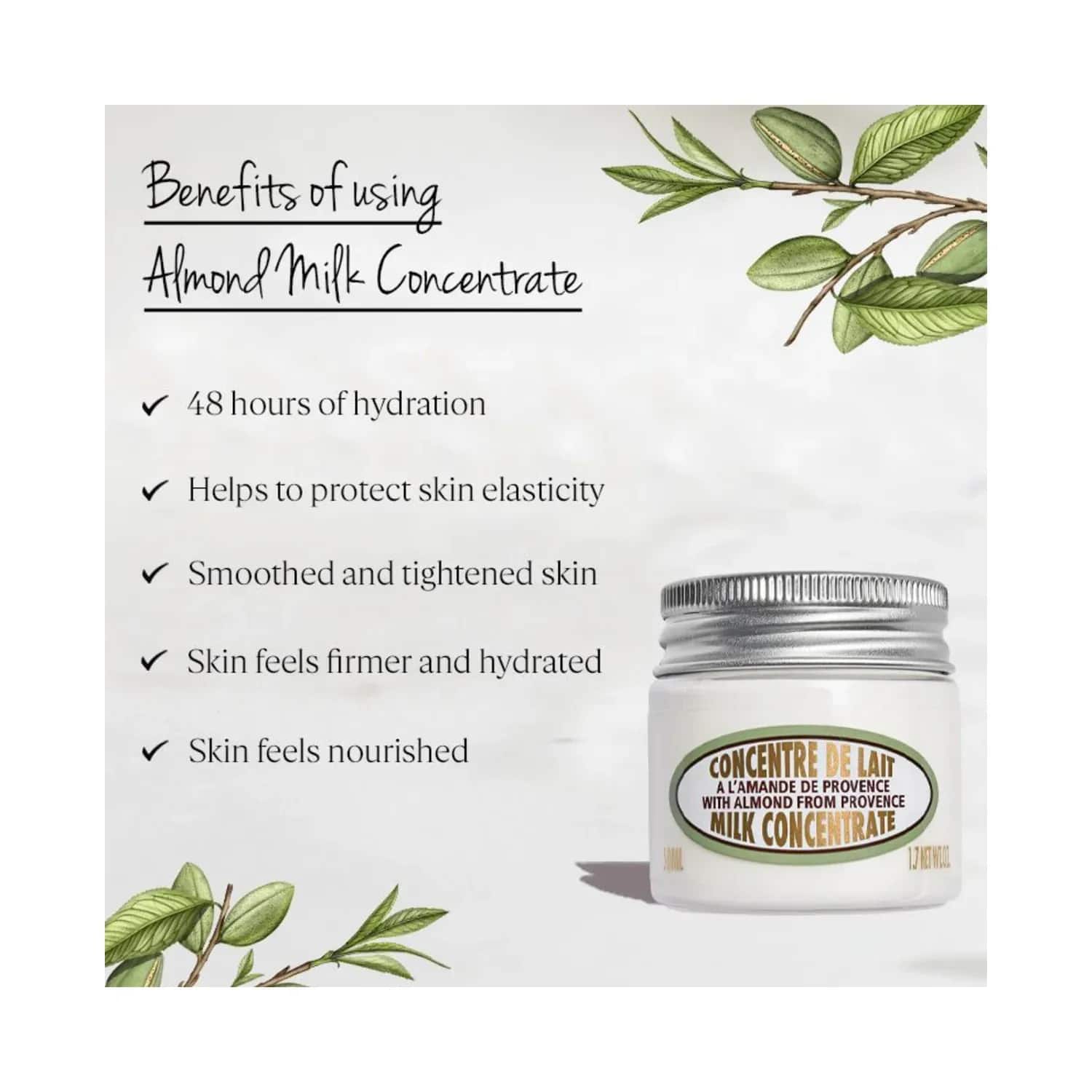Smoothen your skin with the L'Occitane Almond Milk Concentrate - (50ml). This body cream is enriched with almond milk and almond oil to soften the skin texture. The lightweight body cream glides easily on the skin and offers deep nourishment for upto 48 hours to reduce dryness.Key Features & Benefits:Infused with almond milk and almond oil to promote smooth and firm skin and reduce drynessLightweight formula offers smooth applicationDelivers refreshing scent of almonds and vanillaOffers long-lasting hydration for upto 48 hoursVegan body cream has no animal derivativesSuitable for all skin typesKey Ingredients:Almond milk and sweet almond oil: Promote smooth, firm skin and reduce drynessVitamin E: Contains antioxidant properties and prevents loss of skin elasticityGlycerine, omega 9, squalene, almond protein, almond seed extract, and silicium derivative: Moisturise and smoothen the skinHow to Use:After bathing, apply the body cream all over your body and massage it into your skin using slow, circular movements.All Ingredients:Aqua/Water, Isononyl Isononanoate, Cyclomethicone, Glycerine, Cetearyl Alcohol, Methylsilanol Mannuronate, Caprylic/Capric Triglyceride, Prunus Amygdalus Dulcis (Sweet Almond) Oil, Prunus Amygdalus Dulcis (Sweet Almond) Protein, Prunus Amygdalus Dulcis (Sweet Almond) Seed Extract, Juglans Regia (Walnut) Seed Extract, Parfum/Fragrance, Cetearyl Glucoside, Ppg-26-Buteth-26, Carbomer, Sodium Polyacrylate, Phenoxyethanol, Chlorphenesin, Mannitol, Ethylhexylglycerin, Peg-40 Hydrogenated Castor Oil, Menthyl Lactate, Sodium Lauryl Sulfate, Glyceryl Polymethacrylate, Biosaccharide Gum-1, Sodium Metabisulfite, Sorbic Acid, Glyceryl Stearate Se, Xanthan Gum, Benzoic Acid, Dehydroacetic Acid, Polyaminopropyl Biguanide, Tocopherol, Limonene, Linalool, CoumarinAbout the Brand:Founded by Olivier Baussan in 1976 in France, the L'Occitane group comprises six different brands, all offering a wide range of skincare and beauty products that cater to thousands of customers worldwide. The group aims to develop "extraordinary beauty experiences" for all. Their personal care products range from shower gels, bathing bars, hand creams, serums, essential oils, and much more. L'Occitane ensures that all the products are environment-friendly and approved by experts to be safe for use.Check out more L'occitane Body Lotions & Moisturisers options here, or browse through tokocart's full range of Body Lotions & Moisturisers from top global brands.You can also explore other products from the world of L'occitane here on tokocart.