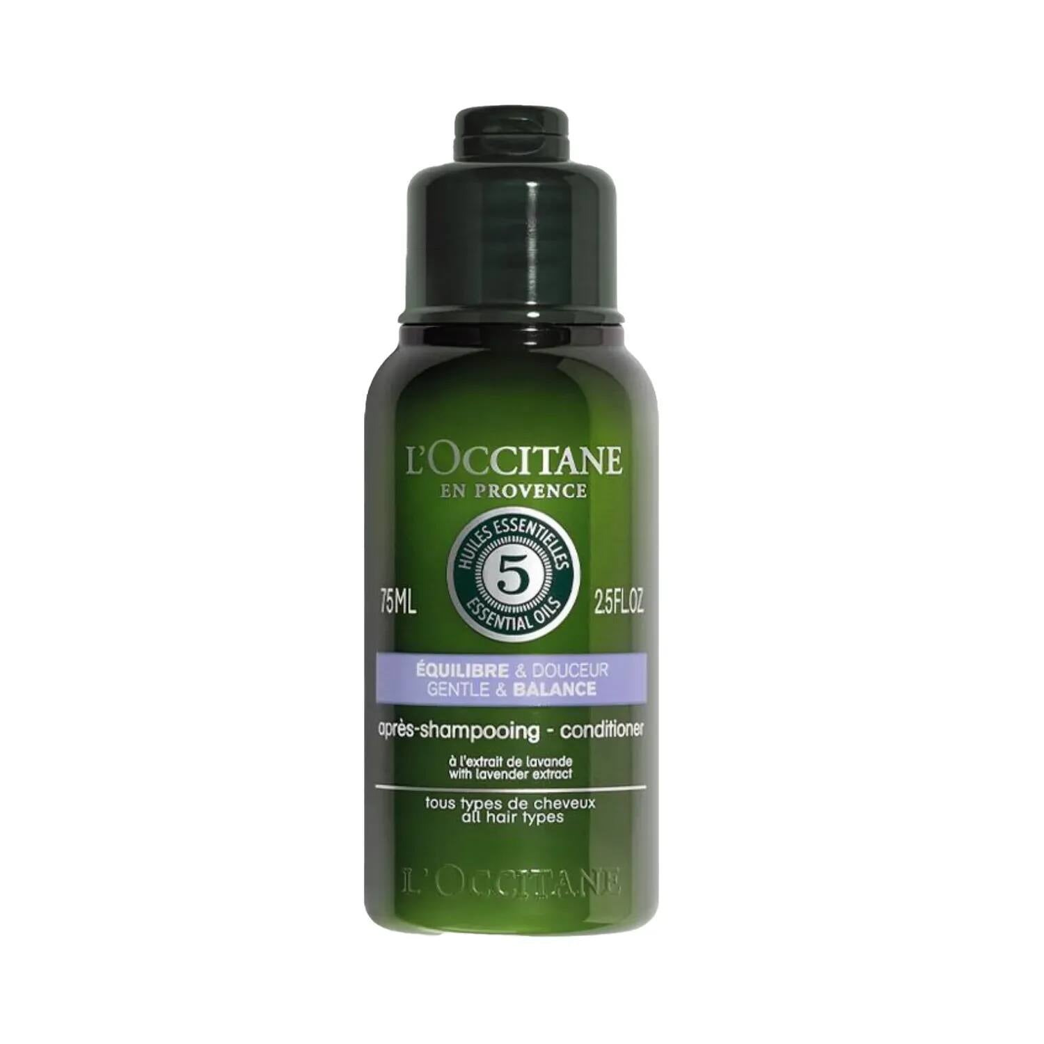 Get soft hair with the L'Occitane Aromachologie Gentle & Balance Conditioner - (75ml). This hydrating hair conditioner is enriched with the goodness of powerful essential oils and botanicals that nourish, soften and detangle your hair to reveal revitalised, silky, smooth strands. The silicone-free hair conditioner with PDO Lavender imparts a relaxing scent to your locks and is safe to use on the scalp and all hair types.Key Features & Benefits:Formulated with PDO Lavender to impart a light fragrance to your tressesSmoothly detangles hair to make it more manageableHydrating conditioner promotes supple, silky locks with regular useSilicone-free gentle conditioner is safe on the scalpFormulated to suit all hair typesKey Ingredients:PDO Lavender essential oil: Has purifying and soothing properties and an exquisite relaxing scentSweet orange oil: Moisturises and improves the smoothness of strandsHow to Use:Apply the conditioner onto wet hair after shampooing. Work into the length of the hair and leave in for 1 minute, then rinse.All Ingredients:Aqua/Water, C13-15 Alkane, Cetyl Alcohol, Coco-Caprylate/Caprate, Distearoylethyl Dimonium Chloride, Lavandula Angustifolia (Lavender) Oil, Rosmarinus Officinalis (Rosemary) Leaf Oil, Anthemis Nobilis Flower Oil, Citrus Limon (Lemon) Peel Oil, Citrus Aurantium Dulcis (Orange) Peel Oil, Helianthus Annuus (Sunflower) Seed Oil, Alpha-Glucan Oligosaccharide, Panthenol, C14-22 Alcohols, Hydroxypropyl Starch Phosphate, Cetearyl Alcohol, Hydroxyethylcellulose, C12-20 Alkyl Glucoside, Ethylhexylglycerin, Sodium Acetate, Isopropyl Alcohol, Cellulose, Citric Acid, Alcohol, Tocopherol, Parfum/Fragrance, Hexyl Cinnamal, Geraniol, Citronellol, Coumarin, Alpha-Isomethyl Ionone, Benzyl SalicylateAbout the Brand:Founded by Olivier Baussan in 1976 in France, the L'Occitane group comprises six different brands, all offering a wide range of skincare and beauty products that cater to thousands of customers worldwide. The group aims to develop "extraordinary beauty experiences" for all. Their personal care products range from shower gels, bathing bars, hand creams, serums, essential oils, and much more. L'Occitane ensures that all the products are environment-friendly and approved by experts to be safe for use.Check out more L'occitane Conditioner options here, or browse through tokocart's full range of Conditioner from top global brands.You can also explore other products from the world of L'occitane here on tokocart.