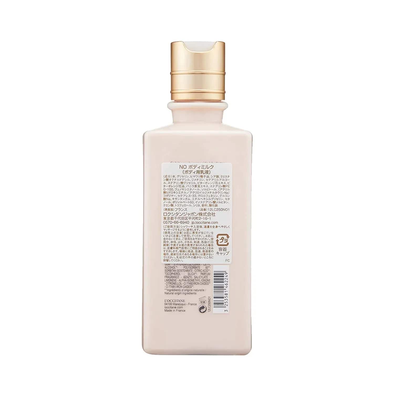 Revitalise your skin with the L'Occitane Neroli & Orchidee Body Milk - (245ml). This nourishing body lotion is enriched with shea butter to deeply nourish and smoothen the skin. The body lotion is enriched with a blend of vanilla, fresh citrus, and floral notes to give a refreshing fragrance and soothe your senses.Key Features & Benefits:Infused with shea butter to nourish the skinContains a mix of vanilla, fresh citrus and floral notes to give a pleasant scentNeroli and orchidee body milk moisturises the skin to make it soft and suppleConditions the skin to reduce drynessKey Ingredients:Shea butter: Deeply nourishes the skinHow to Use:After bathing, apply the body lotion all over your body and massage it into your skin using slow, circular movements.All Ingredients:Aqua / Water, Glycerine, Helianthus Annuus (Sunflower) Seed Oil, Butyrospermum Parkii (Shea) Butter, Octyldodecyl Myristate, Dimethicone, Cetearyl Alcohol, Glyceryl Stearate, Citrus Aurantium Amara (Bitter Orange) Flower Extract, Citrus Aurantium Amara (Bitter Orange) Flower Oil, Vanilla Planifolia Fruit Extract, Peg-100 Stearate, Phenoxyethanol, Sorbitol, Hydroxyethyl Acrylate / Sodium Acryloyldimethyl Taurate Copolymer, Ceteareth-33, Chlorphenesin, Sodium Gluconate, Xanthan Gum, Ethylhexylglycerin, Cetyl Alcohol, Polysorbate 60, Sorbitan Isostearate, Citric Acid, Tocopherol, Silica, Perfume / Fragrance, Benzyl Salicylate, Limonene, Alpha-Isomethyl Ionone, Citronellol, Ci 77492 / Iron Oxides, Ci 77491/ Iron OxidesAbout the Brand:Founded by Olivier Baussan in 1976 in France, the L'Occitane group comprises six different brands, all offering a wide range of skincare and beauty products that cater to thousands of customers worldwide. The group aims to develop "extraordinary beauty experiences" for all. Their personal care products range from shower gels, bathing bars, hand creams, serums, essential oils, and much more. L'Occitane ensures that all the products are environment-friendly and approved by experts to be safe for use.