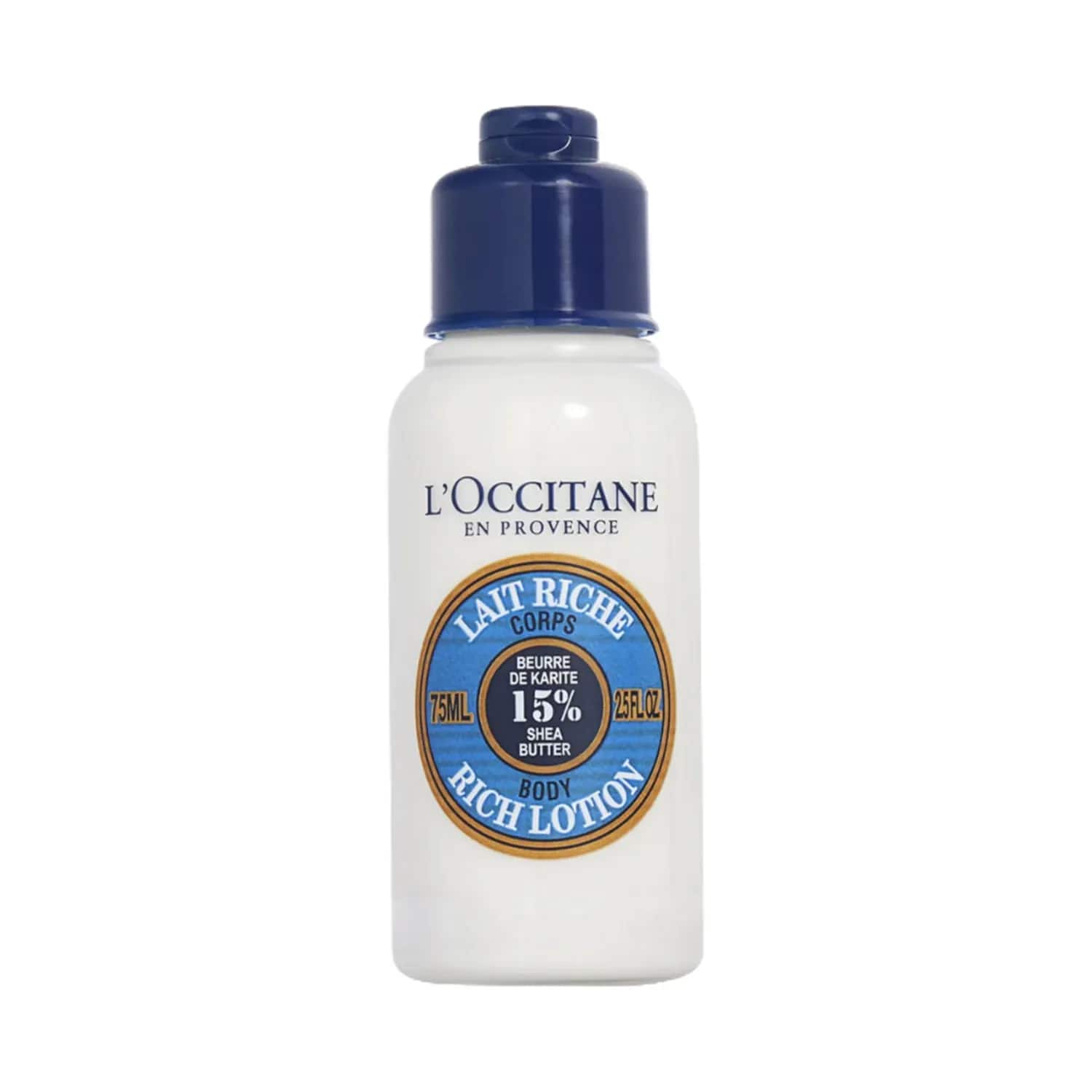 Get creamy soft skin with the L'Occitane Shea Butter Ultra Rich Body Lotion - (75ml). This nourishing body lotion is enriched with 15% shea butter, natural honey, and apricot oil to moisturise, protect and promote healthier skin. This body lotion also contains jasmine and ylang-ylang to give a refreshing fragrance.Key Features & Benefits:Infused with 15% shea butter, natural honey, and apricot oil to nourish and improve the overall appearance of the skinMoisturises and heals dry, rough skinEnriched with jasmine and ylang-ylang for a fresh, light scentCan be used on a daily basis to restore dry skinKey Ingredients:Shea butter, natural honey, and apricot oil: Moisturise, protect, and promote healthier skinHow to Use:After bathing, apply the body lotion all over your body and massage it into your skin using slow, circular movements.All Ingredients:Aqua/Water, Butyrospermum Parkii (Shea) Butter, Helianthus Annuus (Sunflower) Seed Oil, Glycerine, Coco-Caprylate/Caprate, Olus Oil/Vegetable Oil, Polyglyceryl-6 Distearate, Cetyl Palmitate, Calendula Officinalis Flower Extract, Linum Usitatissimum (Linseed) Seed Extract, Mel Extract/Honey Extract, Althaea Officinalis Root Extract, Prunus Amygdalus Dulcis (Sweet Almond) Fruit Extract -Jojoba Esters, Caprylyl Glycol, Cetyl Alcohol, Polyglyceryl-3 Beeswax, Xanthan Gum, Sodium Stearoyl Glutamate, Sodium Polyacrylate, Butylene Glycol, Tocopherol, Citric Acid, Alcohol, Urea, Chlorphenesin, Parfum/ Fragrance, Linalool, Coumarin, Citronellol, Alpha-Isomethyl Ionone, Limonene, GeraniolAbout the Brand:Founded by Olivier Baussan in 1976 in France, the L'Occitane group comprises six different brands, all offering a wide range of skincare and beauty products that cater to thousands of customers worldwide. The group aims to develop "extraordinary beauty experiences" for all. Their personal care products range from shower gels, bathing bars, hand creams, serums, essential oils, and much more. L'Occitane ensures that all the products are environment-friendly and approved by experts to be safe for use.