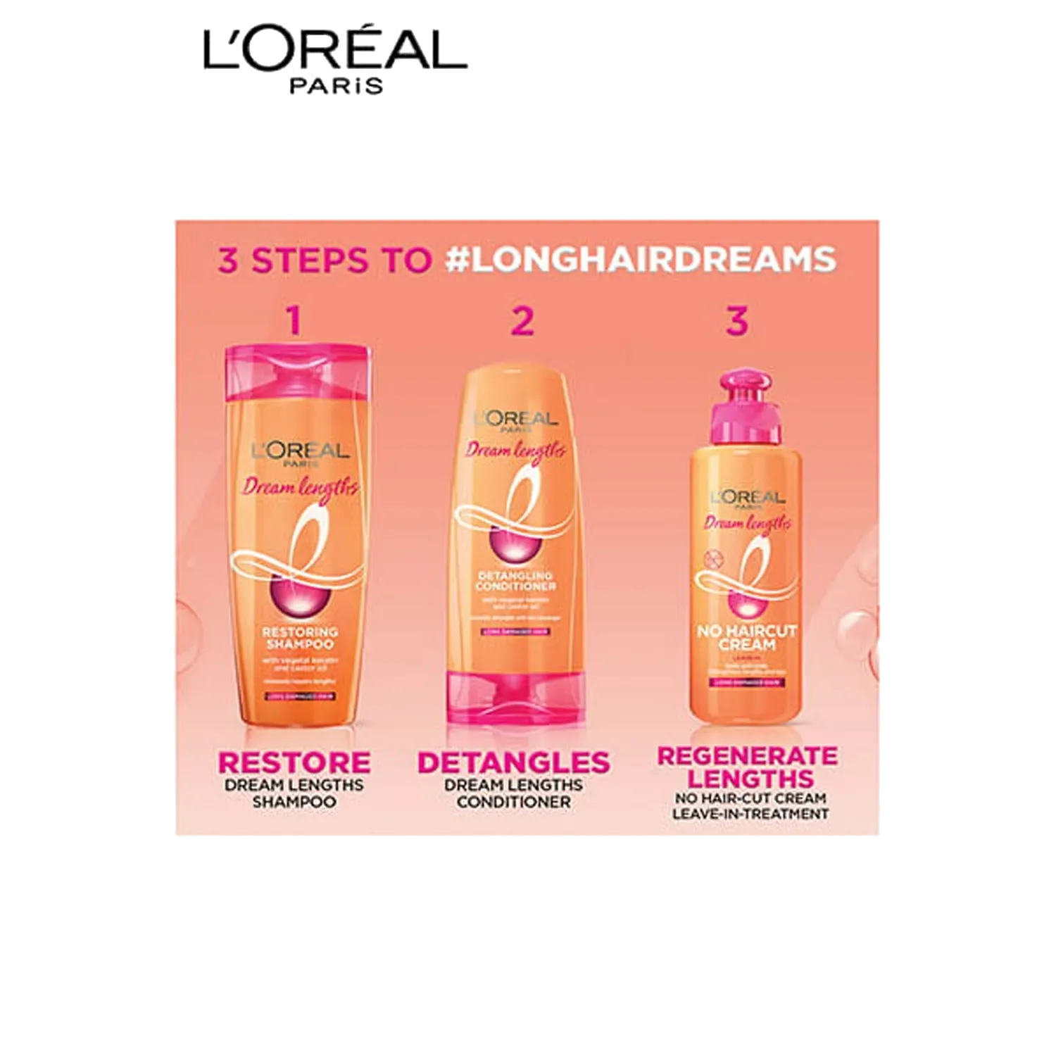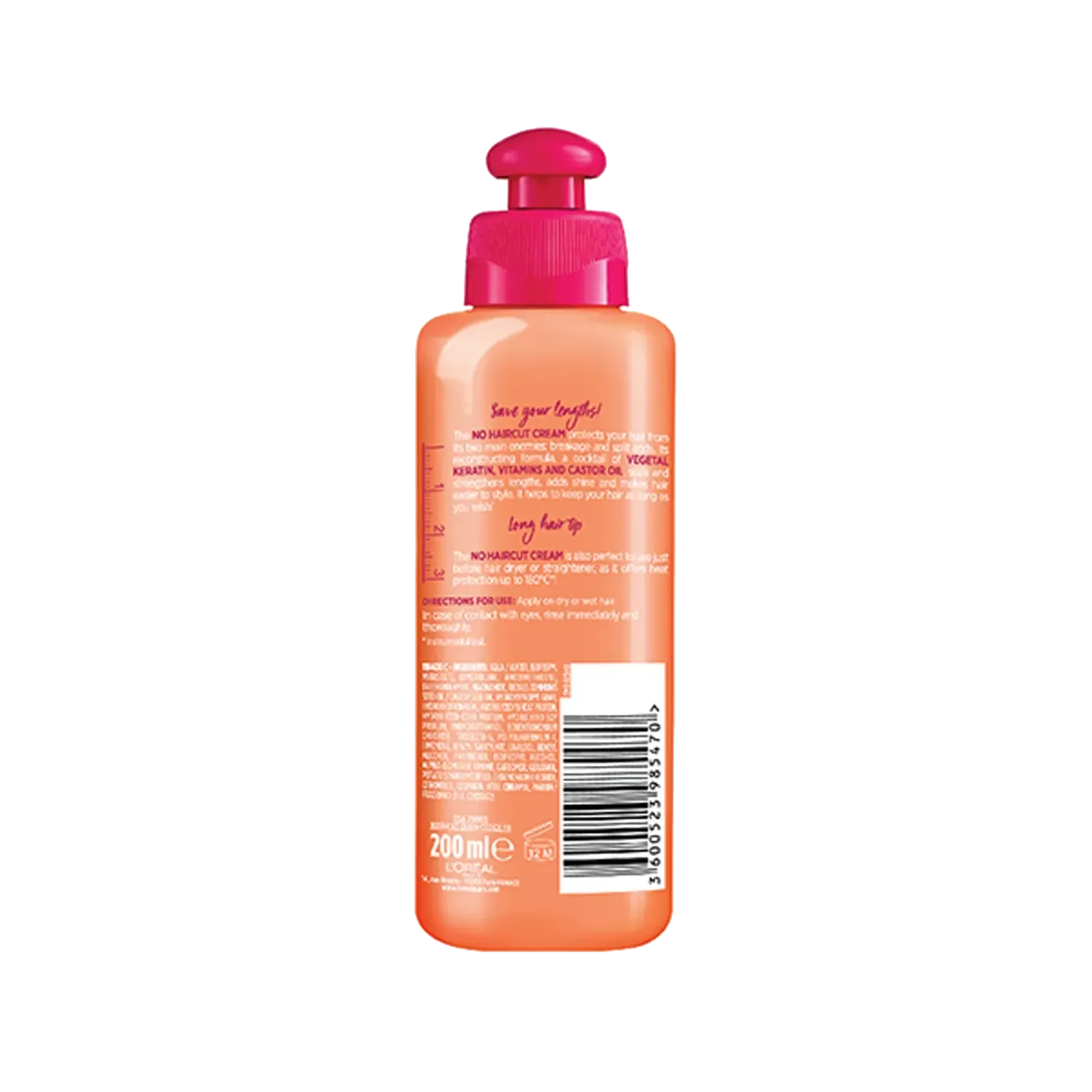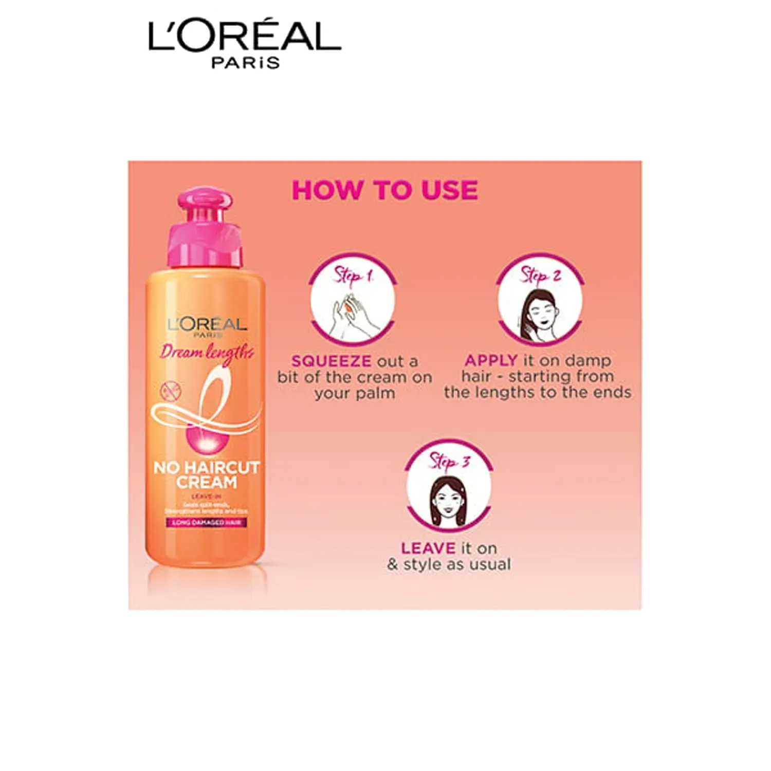 Long hair will no longer be a hassle with the L'Oreal Paris Dream Lengths No Haircut Leave-in Cream. It is infused with vegetal keratin and vitamin B3 and B5 that can aid in improving the overall health of your hair while the castor oil nourishes your hair and prevents hair breakage. This leave-in cream can effectively lock your split ends, keep your ends healthy, and strengthen your hair lengths so that you can get those luscious locks that you have always dreamt of.Key Features & Benefits:Sulphate- and paraben-free hair cream for safe useImbued with vegetal keratin and vitamin B3 and B5 for locking damaged tipsContains castor oil that can provide proper nourishment to the hair while preventing hair breakageIdeal for wet or dry hair and before or after stylingSuitable to use as a heat protectant cream to prevent your hair from extreme heat and damage up to 180 degreesHow to Use:Apply on damp hair, leave in, and style as usual. Use before heat tools!About the Brand:With more than 40 years of pioneering scienti?c research heritage, L'Oreal Paris is proud to offer a stringent selection of the most advanced beauty care with proven ef?cacy and safety to its consumers. Committed to quality, scientific excellence, and permanent innovation, we are proud to be the world's leading cosmetics brand that makes the best of beauty available to all. With L'Oreal Paris, beauty is synonymous with luxury and accessibility, for fans everywhere to make their own. L'Oreal Paris brand encompasses the four major beauty categories - hair colour, cosmetics, hair care, and skin care - and includes such well-known brands as Excellence Creme, Total Repair 5 hair care, Youth Code, Fall Repair, Revitalift, Volume Million Lashes Mascara, Colour Riche lipsticks, Superliners and True Match foundations among many others.Check out more L'Oreal Paris Conditioner options here, or browse through tokocart's full range of Conditioner from top global brands.You can also explore other products from the world of L'Oreal Paris here on tokocart.