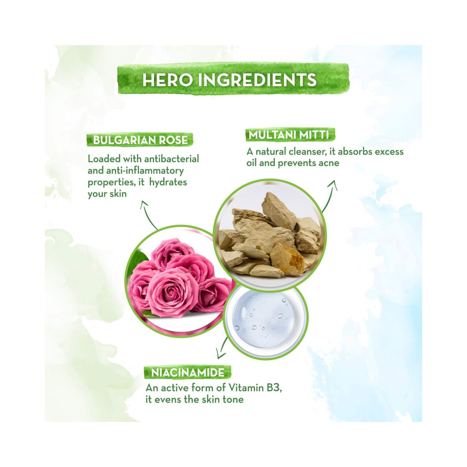Key Ingredients:Bulgarian rose: Provides antibacterial and anti-inflammatory properties and hydrates the skinMultani mitti: Absorbs excess oil and prevents acneNiacinamide: Evens the skin tone