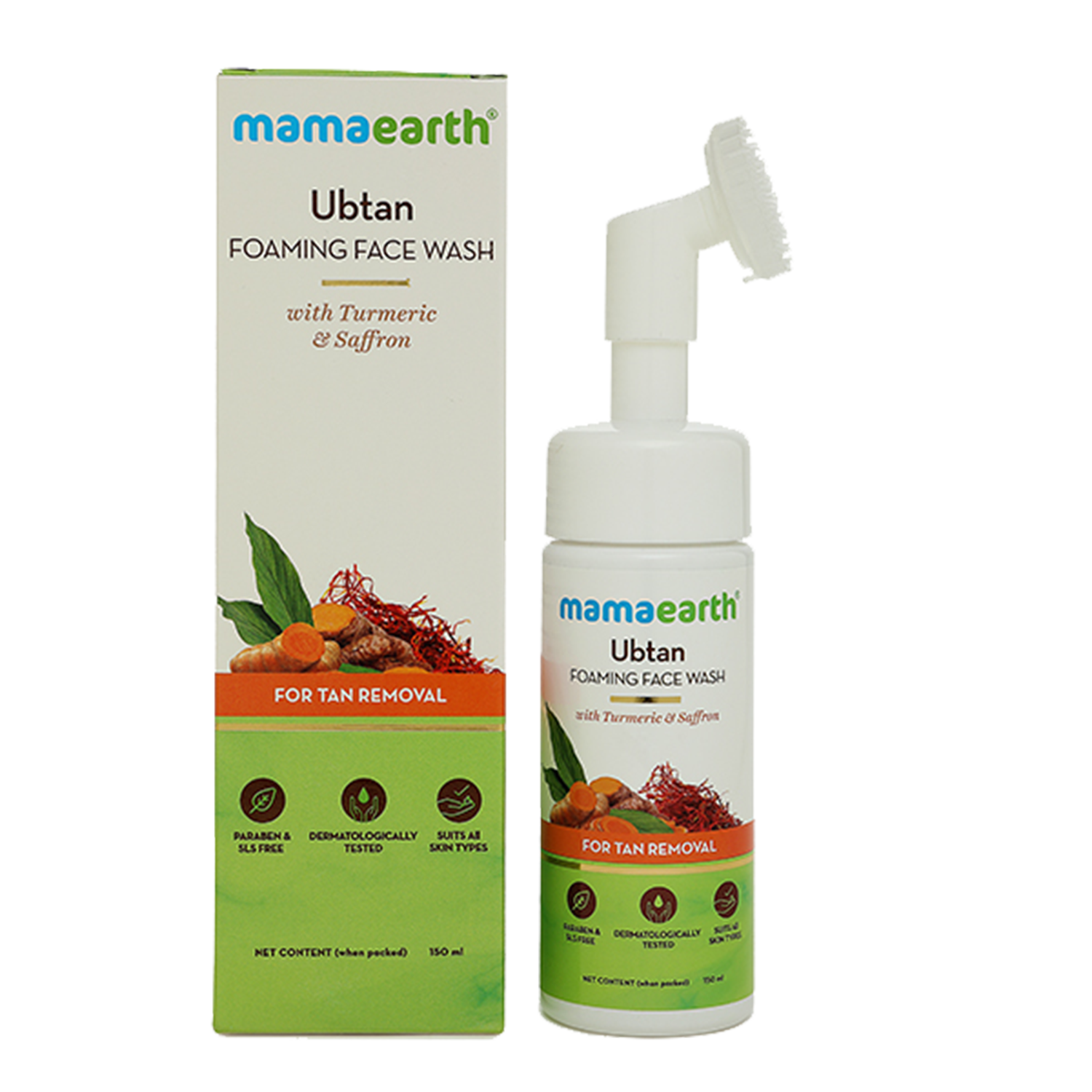 With Mamaearth Ubtan Foaming Face Wash, we welcome gentle exfoliation with a silicone brush and revered natural ingredients like Turmeric and Saffron. With foam texture, the Face Wash deeply penetrates the skin pores, resulting in skin that's visibly clear and healthy. Ubtan Foaming Face Wash clarifies skin and removes tan to promote even skin tone. These goodness of natural ingredients work without disturbing the skin's pH. Shine Like A Diamond! Mamearth Ubtan Foaming Face Wash helps remove tan and improve complexion with Saffron. Turmeric is a natural healer that revives by bringing out skin's natural glow.Key Features & BenefitsBrightens skin toneRemoves tan for clear skinGently exfoliatesNo harmful chemicalsKey IngredientsTurmeric - Provide glow and lustre to the skinSaffron - Provides a burst of nourishment and freshness to the skinAloe Vera - Helps stimulate both collagen and elastin fibres, boosting the elasticity of your skinNeem - Helps even out the skin tone, reduces dark spots making your skin spotlessHow To UseWet your face and neck with water. Pump out the foaming face wash and massage gently all over face and neck with the help of built-in soft brush to remove impurities.Rinse and pat dry. Wash the silicon brush thoroughly with water to maintain regular hygiene.All IngredientsTurmeric, Saffron, Neem OilAbout the BrandMamaearth was founded in September 2016 by Ghazal Alagh and Varun Alagh, to make skincare routines a little chic but with utmost care. Headquartered in Gurugram (India), Mamaearth is distinguished in the cosmetics industry of India as an online platform that offers natural and toxin-free skin care products.