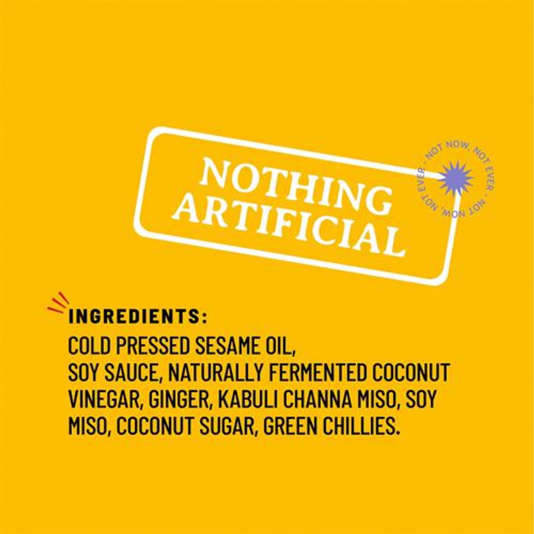Cold Pressed Sesame Oil, Soy Sauce, Naturally Fermented Coconut Vinegar, Ginger, Kabuli Chana Miso, Soy Miso, Coconut Sugar, and Green Chillies.