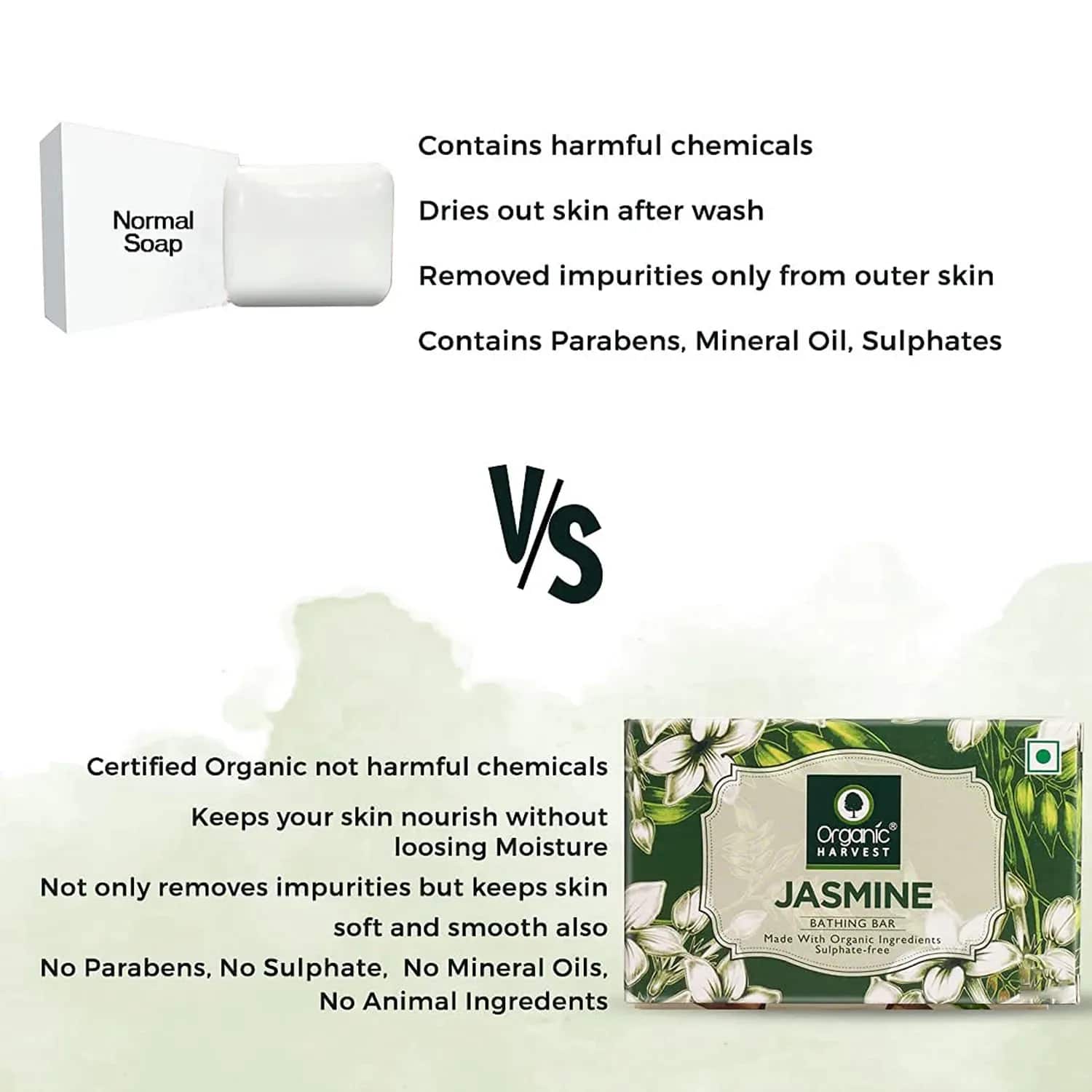 Organic Harvest Jasmine Bathing Bar prevents overtly dry skin to ensure one has a normal level of oil production throughout the day.Key Features & Benefits:Healthy & hydrated skinKey Ingredients:Glycerine - Helps moisturize aging skin by providing skin with moistureHow to Use:Wet skin with water, apply the soap by massaging moist skin evenly to create lather and rinse thoroughly to get a deep cleanse.All Ingredients:Organic Decyl Glucoside, Organic Glycerin, Sodium Cocoate, Sodium Palmitate, Jasmine FragranceAbout the Brand:Founded by Rahul Agarwal in 2013, Organic Harvest is a home-grown brand with an entire range of organic personal care items, specializing in hair care, body care, and skincare products that are safe and highly effective. Their collection is very delicate, safe, and effective because they don't contain any residues of harsh chemicals, parabens, phthalates, mineral oils, PABA, petrolatum, paraffin, or other components derived from animals. The brand uses raw materials from plants without dangerous chemical fertilizers, pesticides, or herbicides and is certified by Global organizations like EcoCert, OneCert & Nature. With their guiding principle to always be completely transparent with their clients, the brand consistently emphasizes being honest about their processes, from organically certified components to the specific concerns their products target and the advantages they bring.Check out more Organic Harvest Soaps options here, or browse through tokocart's full range of Soaps from top global brands.You can also explore other products from the world of Organic Harvest here on tokocart.