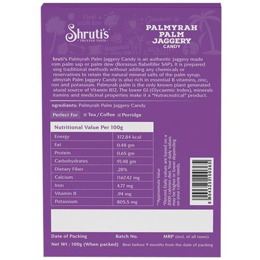 Shruti’s Palmyra palm jaggery candy is made from palm sap(Borassus flabellifer SAP) and cane jaggery powder. Shruti’s Palm candy is nutritionally rich in minerals like Calcium, Iron and Phosphorous which are essential for the growth of strong bones and teeth in growing children. Palmyra palm is the only known plant generated natural source of Vitamin B12 and has lower GI(Glycaemic Index).