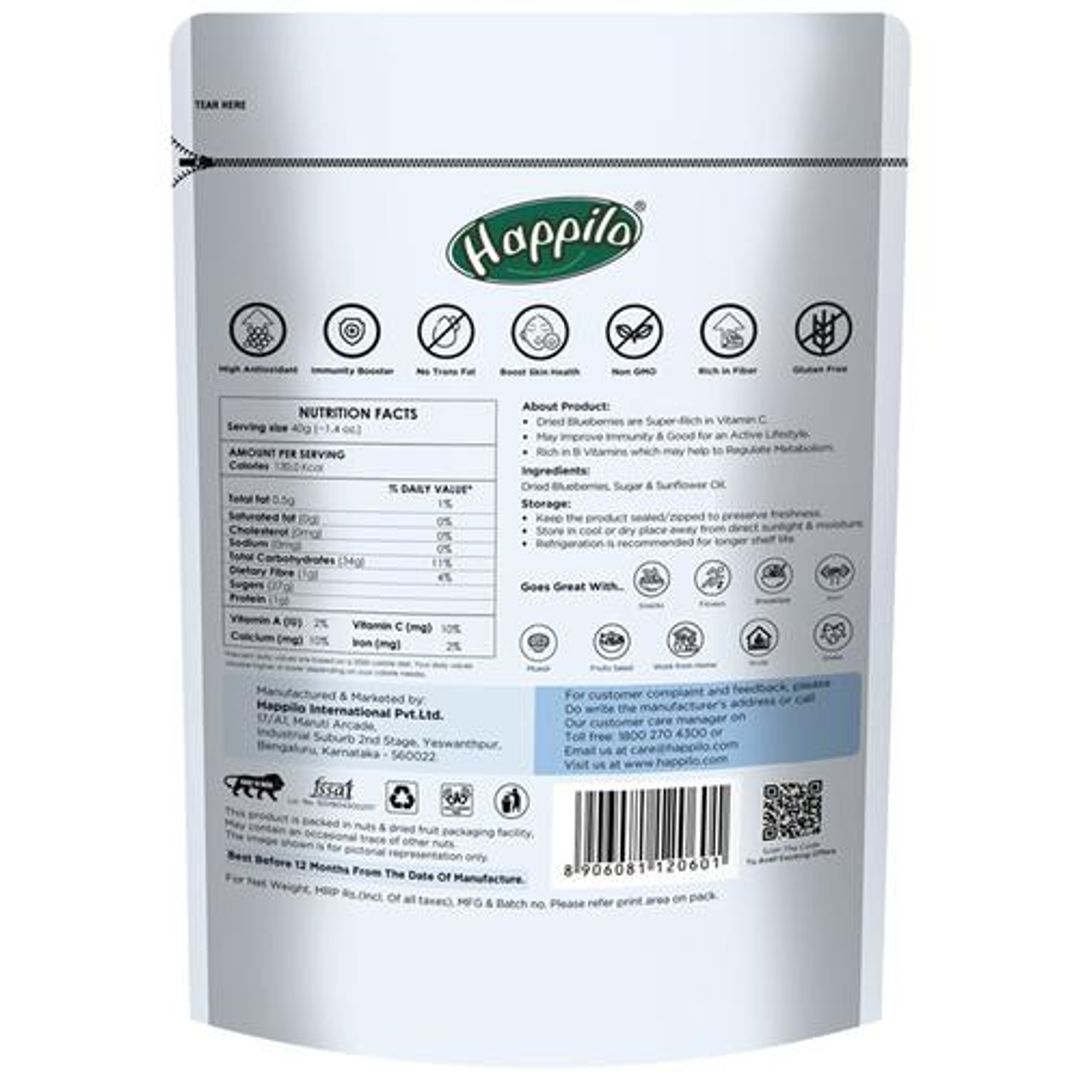 Happilo Premium Dried Californian Blueberries are slightly sweetened and ideal for snacking, mixing in cereals, or adding to cakes and muffins. It is healthy, plump, and sweet. It comes in air-tight pouch packing to retain the freshness and flavour of the content. It contains low fats so it can prefer by those who are working on weight management.1. Low fats, calories and sodium.
