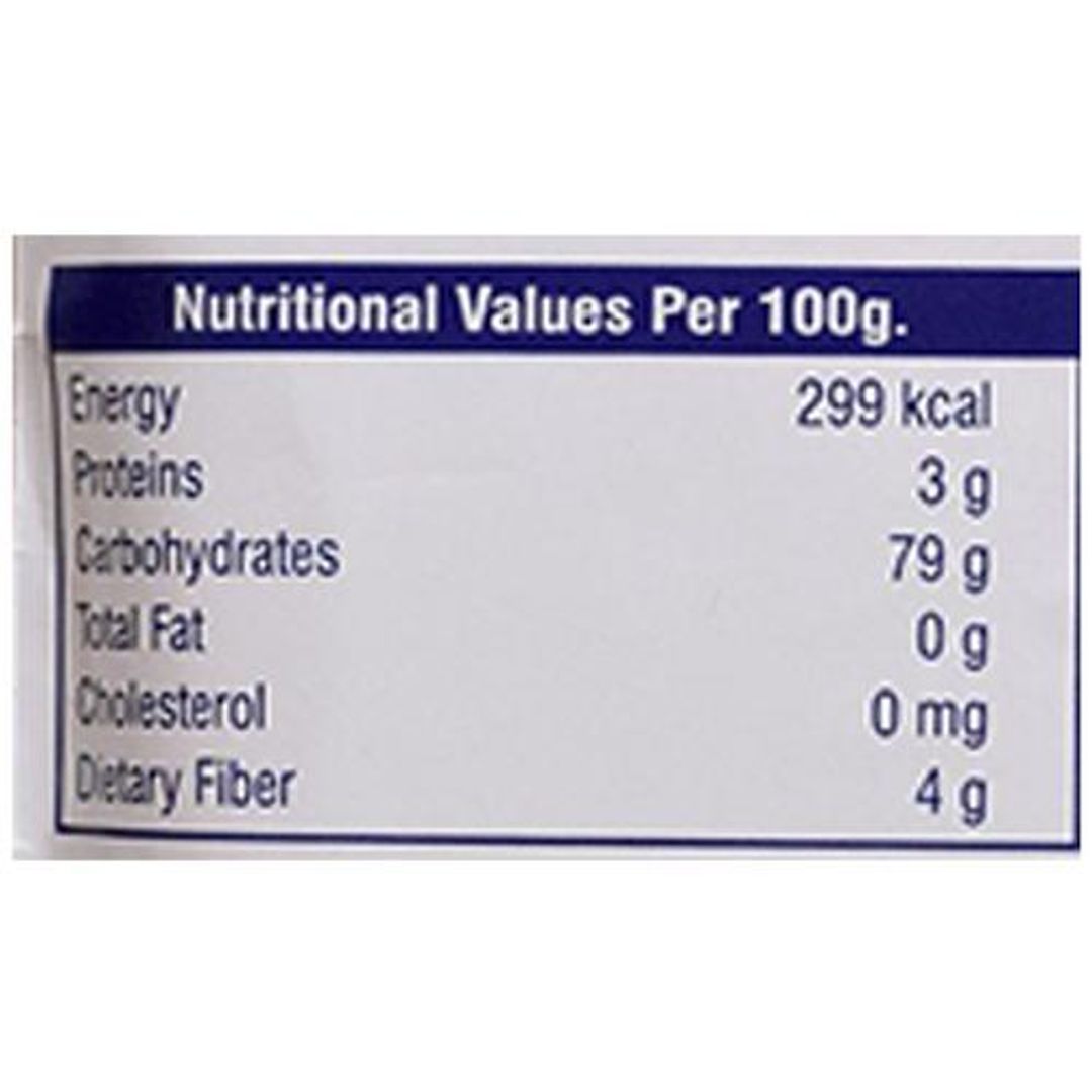 Energy - 299 kcal, Protein - 3.0 g, Carbohydrates - 79 g, Total Fat - 0 g, Cholesterol - 0 mg, Dietary Fiber - 4 g.