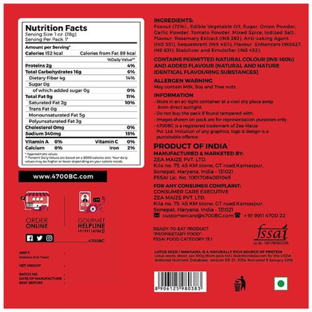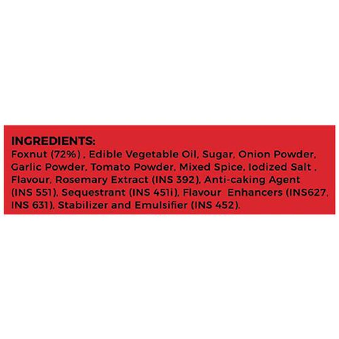 Foxnut (72%), Edible Vegatable Oil, Sugar, Onion, Garlic, Tomato, Edible Common Salt, Flavor Food Colour (E160B), Anti-oxidant (E319), Mixed Spices, Acidity Regulator (E330, E331), Anti-foaming agent (E900), Anti-caking agent (INS 551), Sequestrant [INS 451 (I)], Flavour Enhancers (INS 627, INS 631), Stabilizers and Emulsifiers (E452)