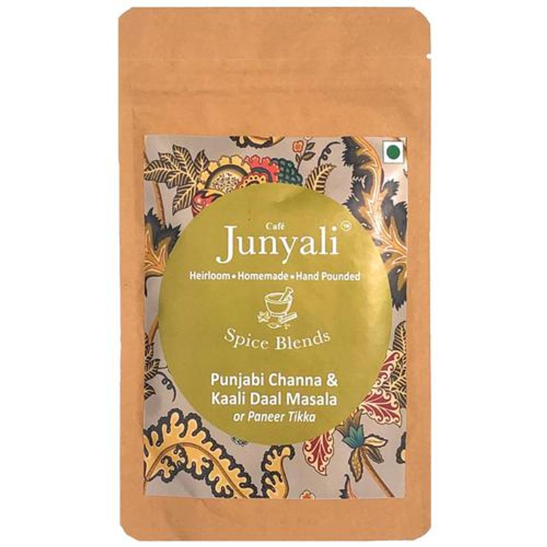 Punjabi Chana/Kaali Daal : Soak chickpeas or a combination of lentils with rajma (Kaali Dal). Heat clarified butter, chopped onions, garlic, ginger and the Punjabi Channa & Kaali Dal Masala. Add extra coriander, amchur and red chilli powder, if required. Add salt and grated tomato. Cook till oil separates. Then add boiled chickpeas or lentils. Add Junyali Sifar Garam Masala for added flavour & taste. Add cream in the lentils. This spice blend can also be used as a seasoning for dahi wada and grilled cottage cheese or grilled meats. In addition, it can be used as a filling in bitter gourd and okra.