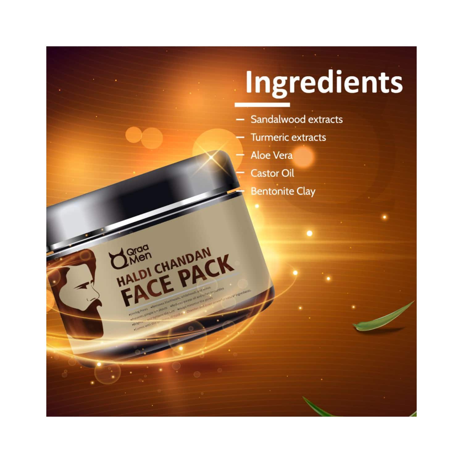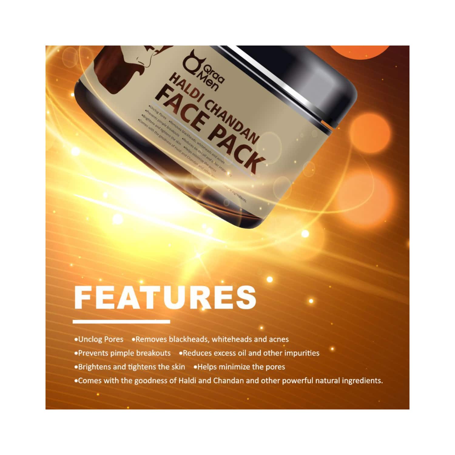 Pamper your skin with the Qraa Men Haldi Chandan Face Pack (120g). This turmeric face pack makes pores and blackheads less noticeable and absorbs excess sebum, leading to translucent skin. The Qraa men's face pack has skin-brightening properties that add an instant glow to your skin.Key Features & Benefits:Enriched with the goodness of turmeric and sandalwood to lighten your skin tonePurifying face pack cleanses your skin to make it smoothYouth boosting face pack rejuvenates your skinAnti-inflammatory face pack controls acne, blackheads, and breakoutsKey Ingredients:Turmeric and Sandalwood: Lighten skin toneAloe vera: Soothes your skinHow to Use:First, cleanse your face and pat dry using a soft towel. Then, apply a generous amount of this pack to your face and neck. Avoid contact with eyes. Wait till it dries out completely. Once dry, rinse with water, followed by applying a moisturizer.About the Brand:Qraa is India's leading natural cosmetics company. India is known worldwide for its wealth of medicinal and therapeutic herbs and the 5,000-year-old Ayurvedic science that practices the effective use of these herbs. After that, Qraa created scientifically engineered products that deliver the same powerful benefits for longer in less time. They believe in the active use of ingredients. Each of their products contains a combination of extracts from various herbs to protect, heal and improve the face, body, and hair.Check out more Qraa Masks & Peels options here, or browse through tokocart's full range of Masks & Peels from top global brands.You can also explore other products from the world of Qraa here on tokocart.