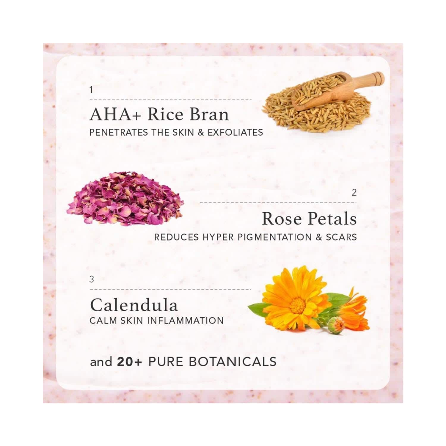 Key Ingredients:Cellulose powder: Increases the amount of moisture in the skinRice bran husk: Has vitamin E to nourish the skinRose petal powder: Boosts collagen production and lightens blemishesAHA: Penetrates deep to rejuvenate skin cellsCalendula and coconut milk: Soothe the skin