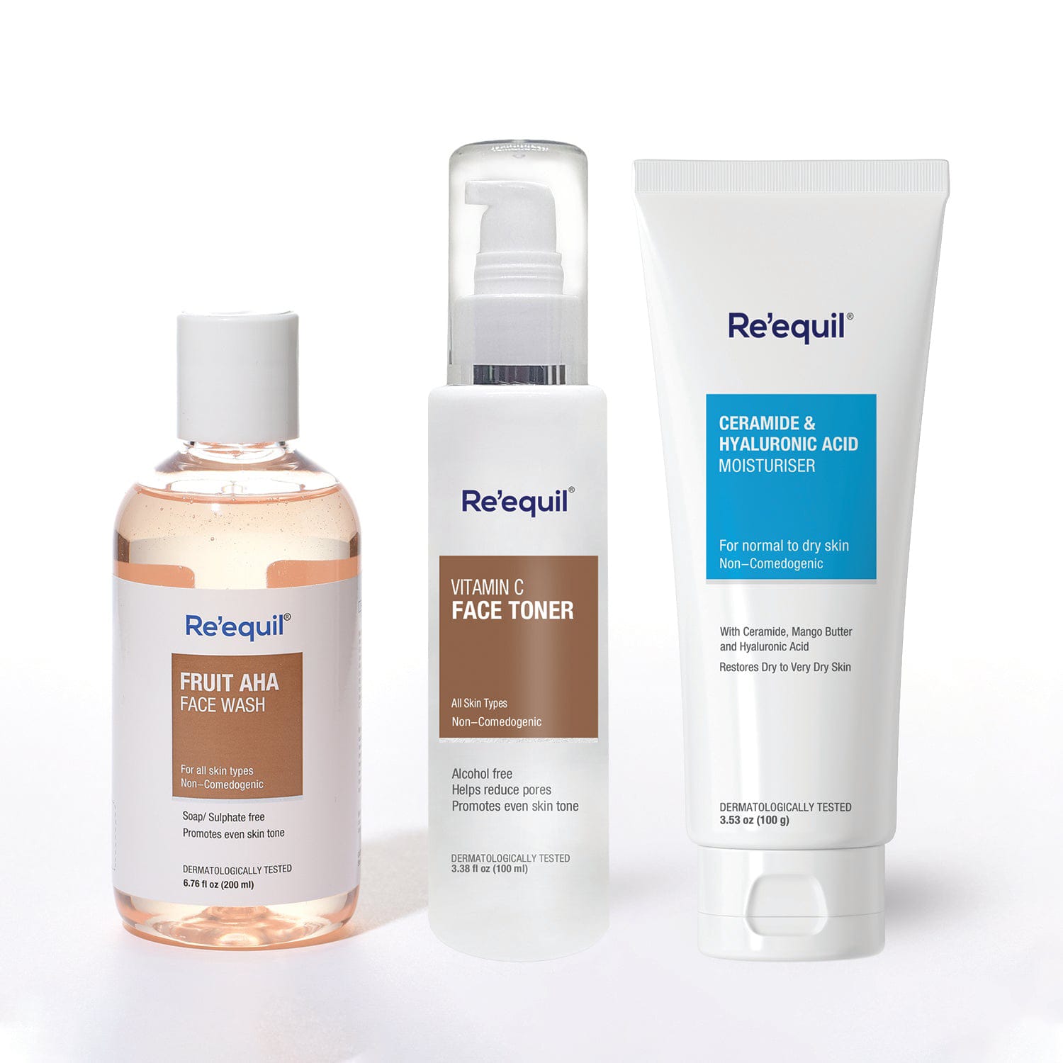 A regime that improves the moisture retention capability of the skin and relieves the skin from itch, redness or a scaly appearance.Dry skin is easy to care for with the correct formulations and ingredients. Begin your regime with our soap-free AHA cleanser. Follow it up with an alcohol-free Vitamin C Toner. Lastly, lock in essential moisturiser with Ceramide and Hyaluronic Acid Moisturiser.Re'equil Fruit AHA Face Wash (200ml)