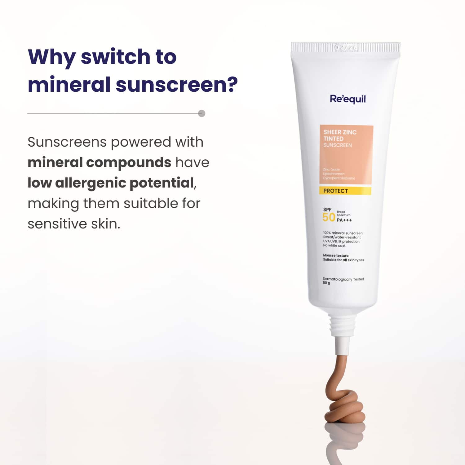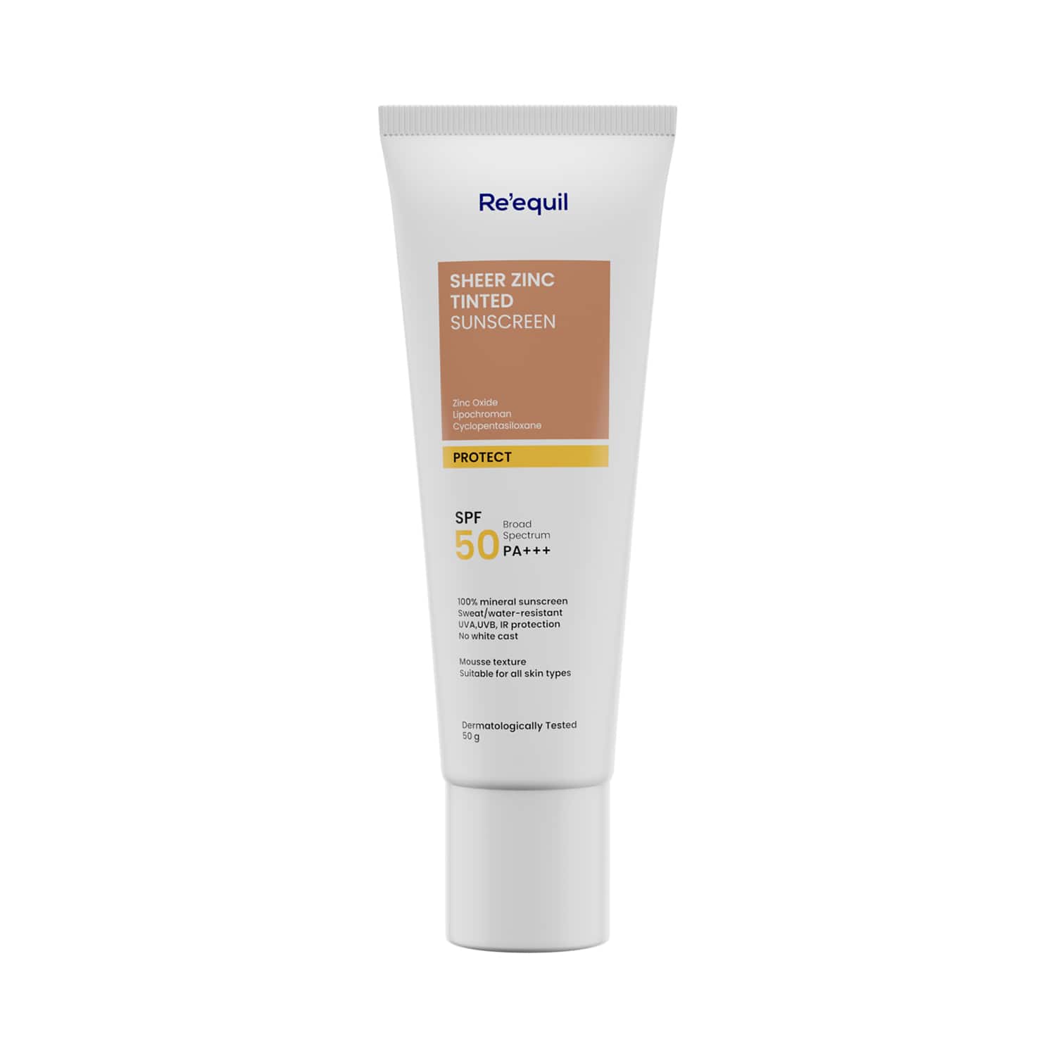 Safeguard your skin with the Re'equil Sheer Zinc Tinted Mineral Sunscreen SPF 50 - (50g). It is a mousse-like textured sunscreen that blends seamlessly on all skin tones. This Re'equil sunscreen formulated with zinc oxide reflects off the harmful rays from your skin. The mineral sunscreen is made free of toxic chemicals and is safe to use on the skin.Key Features & Benefits:Infused with zinc oxide that reflects UVA and UVB rays off the skinBlends effortlessly on all skin tonesOffers SPF 50 protection to shield your skin from sun damageParaben-free sunscreen for safe useHow to Use:Take a little bit of sunscreen on your hand. Dab it over your face and neck in a circular motion for easy absorption of the cream. If you apply makeup later, ensure that you wait five minutes after applying the cream for better absorption.All Ingredients:Cyclopentasiloxane, Zinc Oxide, Caprylyl Methicone, Dimethicone/ Vinyl Dimethicone Crosspolymer, Polyhydroxystearic Acid, Peg-12 Dimethicone/Ppg-20 Crosspolymer, Polyglyceryl-2 Oleate, Polyglyceryl-2 Stearate, Physalis Angulata Extract, Silica, Caprylic/Capric Triglyceride, Coco Caprylate Caprate, Triethoxycaprylylsilane, Dimethylmethoxy Chromanol, Isononyl Isononanoate, Hydrogenated Styrene/Butadiene Copolymer, Sorbitan Oleate, Aluminum Hydroxide, Isopropyl Titanium Triisostearate, Bis-Peg-15 Dimethicone/Ipdi Copolymer, Peg-2 Soyamine, Ci 77492, Ci 15850, Ci 77499About the Brand:Re’equil was launched in 2018 as India’s first online direct-to-consumer cosmeceutical brand. It deals with products that offer healthy skin and hair for customers. All the products from the brand are dermatologically tested and are proven safe against any skin allergies, reactions, or inflammations. The brand is also socially committed, and for every product you purchase, the brand provides a mid-day meal for an underprivileged child.