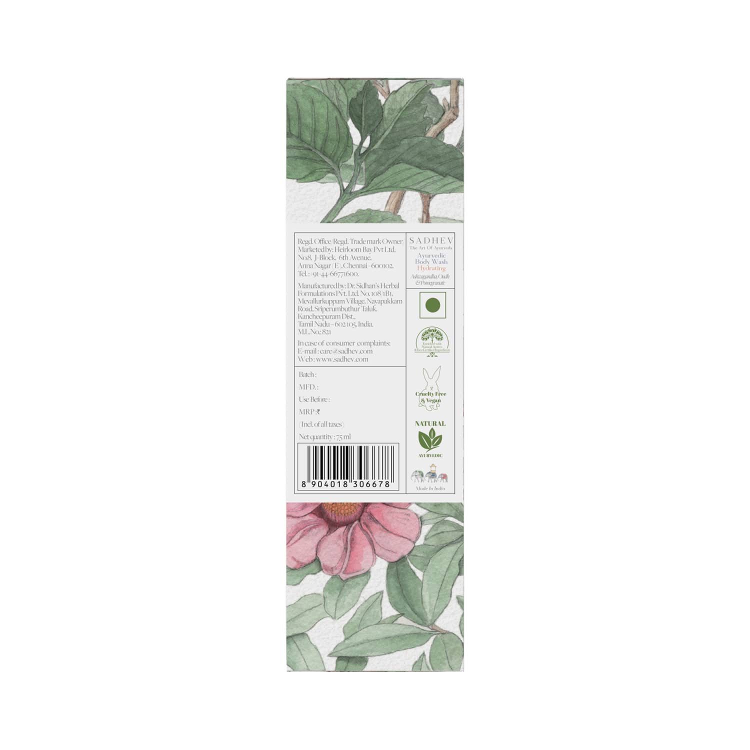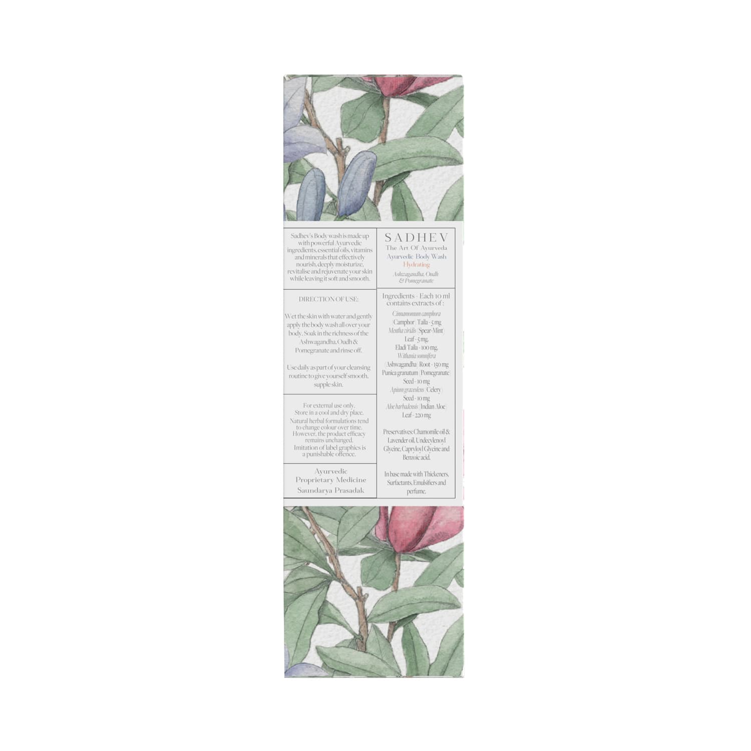 Elevate your daily showering routine with the Sadhev Ayurvedic Hydrating Body Wash With Ashwagandha, Oudh & Pomegranate (75ml). This nourishing body wash contains powerful ayurvedic ingredients like ashwagandha, oudh, pomegranate extract, essential oils, vitamins, and minerals to deeply condition, moisturize, and rejuvenate the skin. Also, this Sadhev ayurvedic body wash boosts the skin's natural radiance and enhances the skin tone.Key Features & Benefits:Formulated with ashwagandha, oudh, and pomegranate extracts to nourish and replenish the skinHydrating body wash cleans and moisturizes the skin without over-dryingBrightens the complexion and skin toneAyurvedic, vegan formula is free from sulfate and paraben to ensure safe use on all skin typesKey Ingredients:Ashwagandha: Revitalizes the skin and helps de-stressOudh: Regenerates new skin cells and fights premature agingPomegranate: Hydrates the skin and protects it from UV raysHow to Use:To start, pour the body wash on a wet loofah. After that, squeeze the loofah to create a lather and massage it on your damp skin. Then, rinse off the body wash with water and towel dry your body to get soft and fragrant skin.About the Brand:The beginning is always from the roots, A journey with his mother to his ancestral home in the quaint town of Vallapad in Kerala, to pay respects to their forefather, Cholayil Kunju Maami Vaidyar, stirred the beginning of Sadhev for Lasakan Cholayil.Renowned for his unconventional healing techniques during his time, Vaidyar was regarded as the doyen of Ayurveda for having created countless miraculous treatments and exceptional cures.200 years later, a sunny afternoon walk in his ancestral hometown, by the meandering blue streams across the endless coconut groves sparked the idea of bringing the secrets and science of his forefather's Ayurvedic experience for the modern connoisseur of today.Lasakan's flame grew brighter as he continued to fuel his ignited passion with a desire to bring to this world of noise, chaos, chemicals and plastics a solution from ancient wisdom that would restore perfect inner balance and enchanting outer beauty.Lasakan and his mother Jayadevi Cholayil launched Sadhev, a stirring curation of exotic beauty and wellness treatments in 2019. The luxury Ayurvedic care blissfully blends the science of wellness with the art of Ayurveda to create an inextricable symphony of the body, mind and soul.Products from Sadhev are infused with precious insights from traditional Ayurveda, delicately blended with pure ingredients, sourced responsibly and carefully from Sadhev's own 80 acre sustainably grown organic sanctuary- Sadhevana in South India.Farmers of Sadhevana nurture the Earth with care, using sustainable farming practices steeped in ancient agricultural wisdom. Botanicals that do not grow in India are carefully sourced from their true origins, from organic estates across the world, enabling the use of only the purest and choicest ingredients in every creation. For example, Argan Oil from Morocco, Saffron Petals from the Valleys of Afghanistan, Butters from Switzerland and Rose Absolute from Bulgaria are handpicked to make Sadhev's exotic infusions.Check out more Sadhev Body Wash & Shower Gel options here, or browse through tokocart's full range of Body Wash & Shower Gel from top global brands.You can also explore other products from the world of Sadhev here on tokocart.