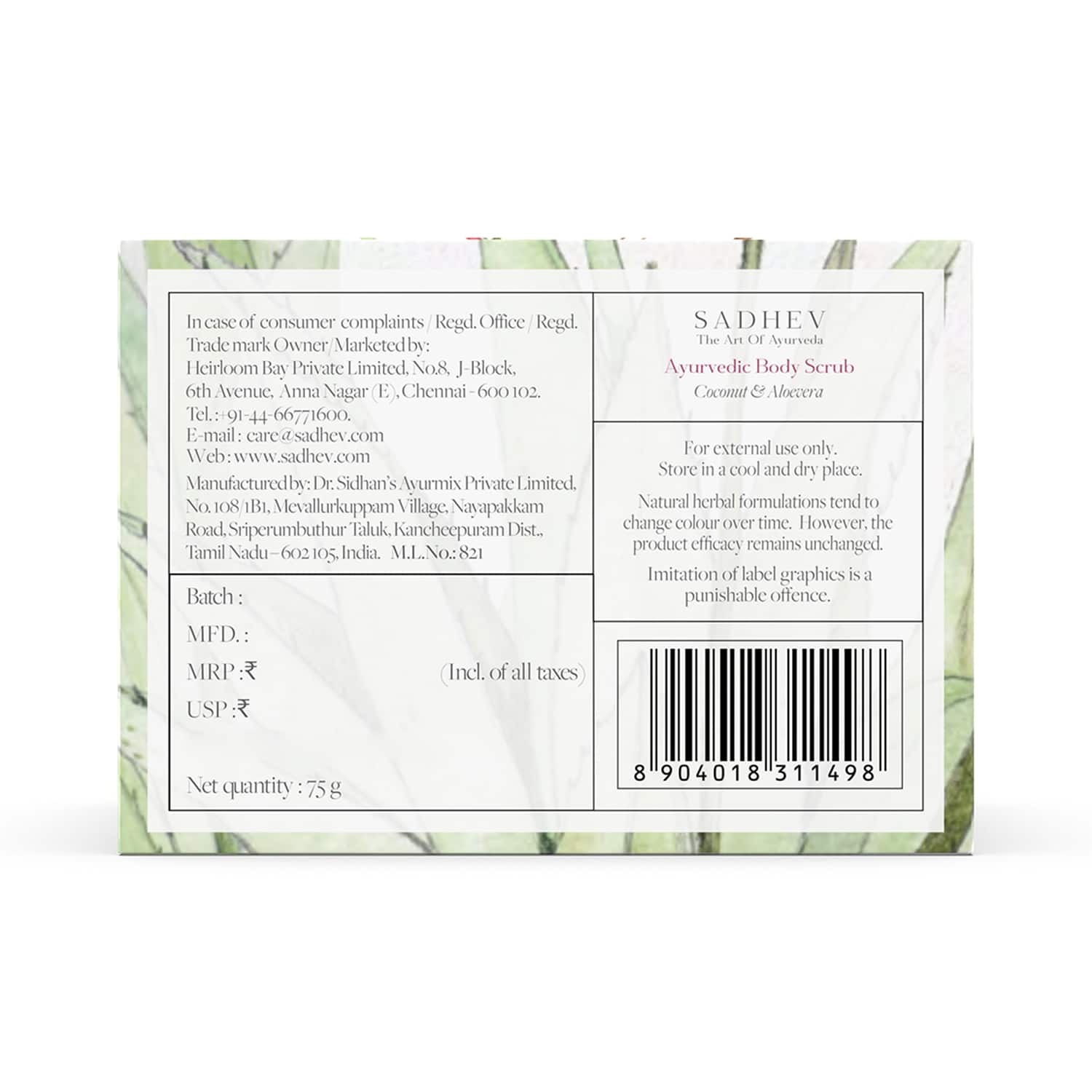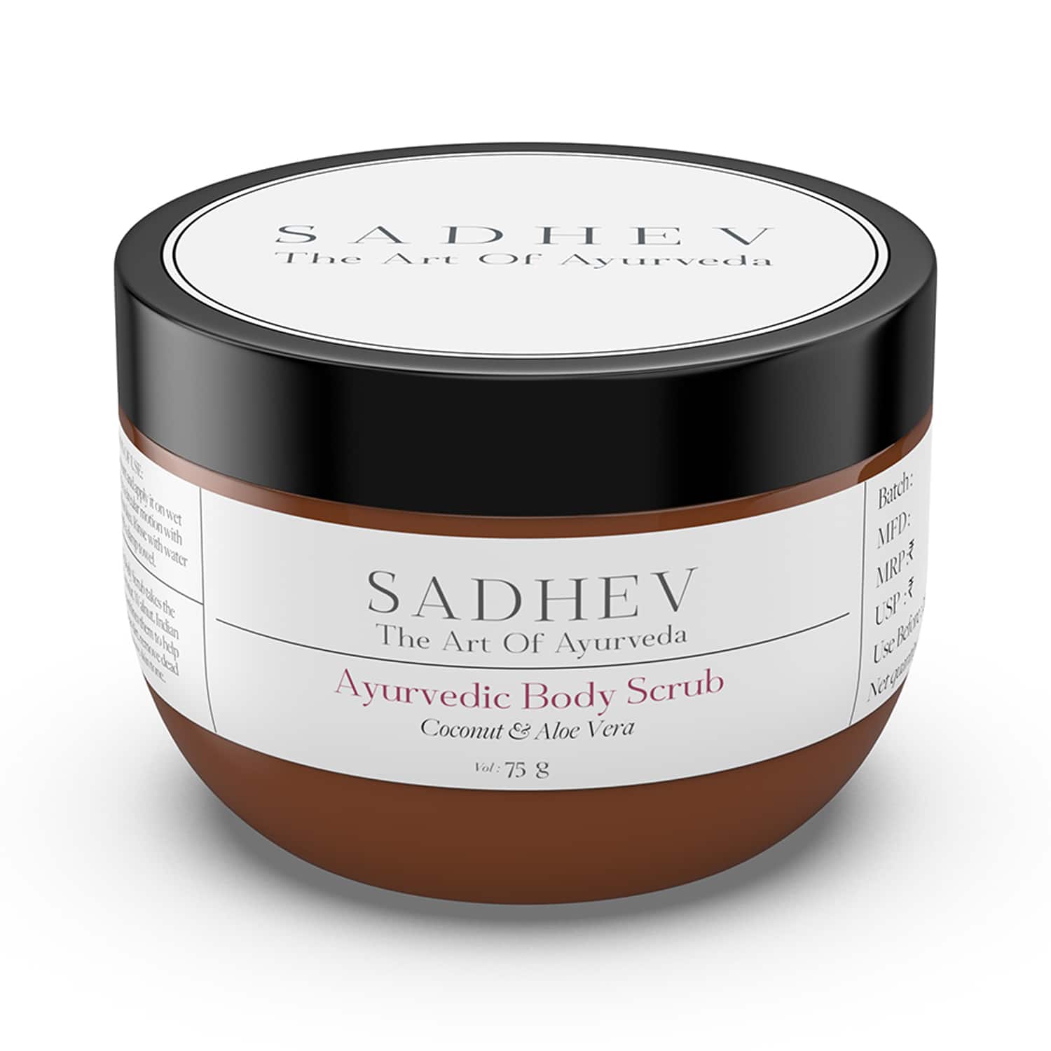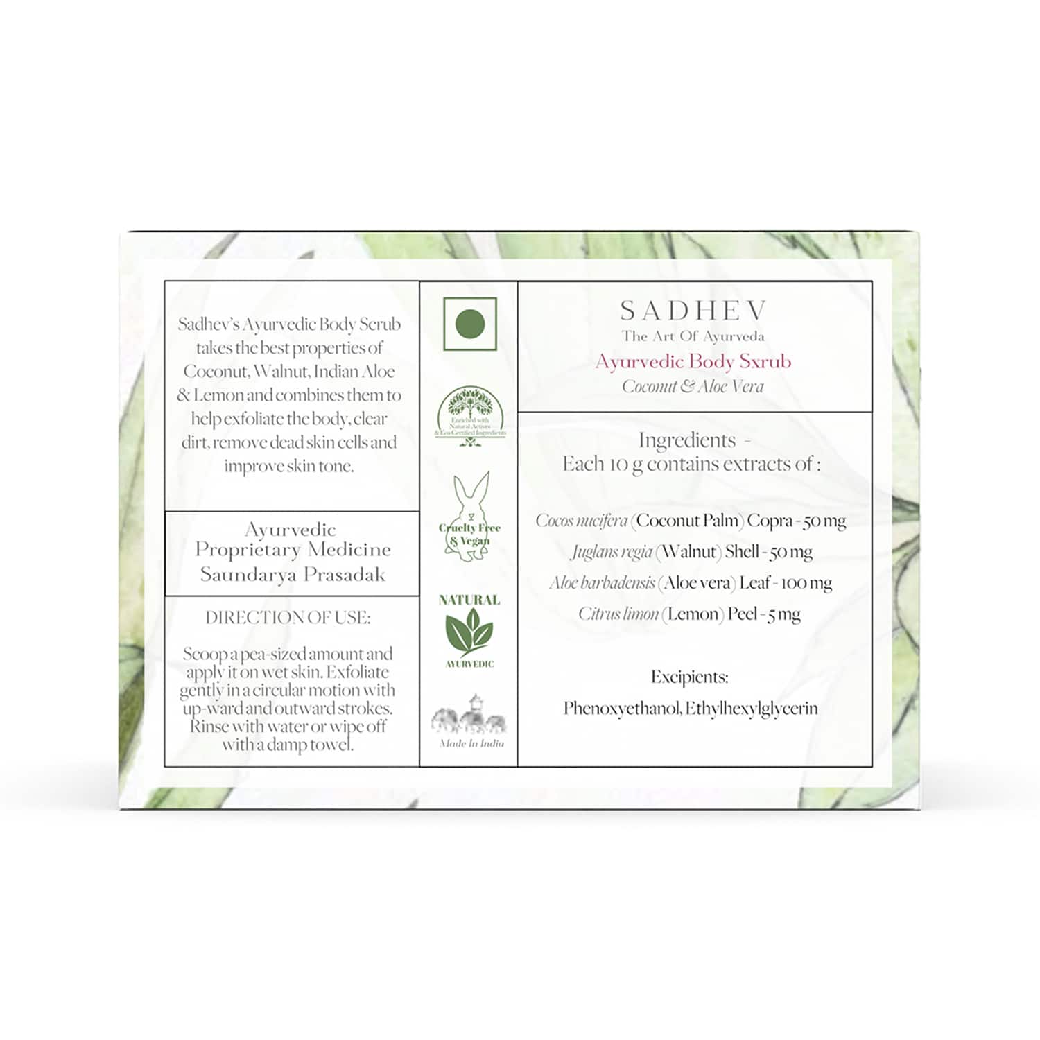 Indulge in the ultimate self-care ritual with the Sadhev Natural and Ayurvedic Coconut and Aloe Vera Body Scrub (75 g). Crafted with a blend of coconut, walnut, Indian aloe, and lemon, this powerhouse exfoliant clears dirt, removes dead skin cells, and enhances skin tone. Experience the transformation as it reveals radiant, petal-soft skin. Infused with a refreshing fruity scent, this skincare marvel revitalizes both your skin and senses, leaving you with a luminous complexion.Key Features & Benefits:Enriched with walnut extracts to provide gentle exfoliation, revealing smoother complexionInfused with coconut and Indian aloe extracts to hydrate, soothe, and nourish the skin, leaving it soft and suppleFortified with lemon extracts to reduce the appearance of dark spots for a bright and radiant glowAyurvedic, natural, vegan, sulphate-free, paraben-free, and cruelty-freeKey Ingredients:Coconut: Hydrates and nourishes the skin, leaving it soft and suppleWalnut: Provides gentle exfoliation, revealing smoother, brighter skinIndian aloe: Soothes and moisturizes, promoting skin healing and regenerationLemon: Brightens and tones, reducing the appearance of dark spots and uneven skin toneAll Ingredients:Walnut - Removes impurities and dead skin cells. Indian Aloe - Regenerates damaged skin cells and healing agent. Lemon - Anti-bacterial agent.How to Use:Take a pea-sized amount of scrub and apply it to damp skin. Gently exfoliate using circular motions, moving upwards and outwards. Rinse with water or wipe off with a damp towel.About the Brand:Sadhev embodies the wisdom of seasoned Ayurvedic Vaidyars, infusing their expertise into each handcrafted creation tailored to specific skin and hair needs. Rooted in traditional Ayurveda, Sadhev products combine ancient insights with responsibly sourced, pure ingredients. These treasures are meticulously gathered from Sadhev's sustainable organic sanctuary, Sadhevana, nestled across 80 acres in South India.