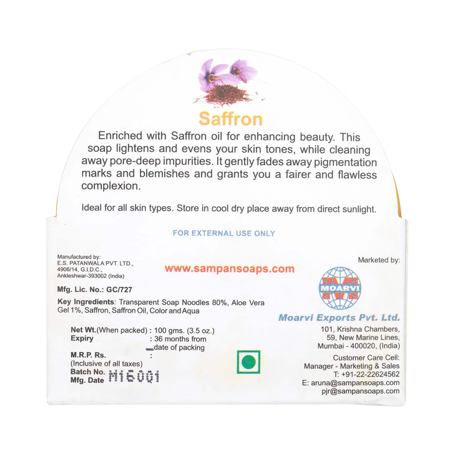 The Sampan Handcrafted Glycerin Saffron Bathing Bar - (100g) gives your skin a royal essence. The bathing soap contains saffron oil, proven to brighten, even out, and improve the complexion. It thoroughly cleans your skin and clears clogged pores. Additionally, saffron in the soap is renowned for making skin look perfect by gradually fading pigmentation, scars, and blemishes.Key Features & Benefits:Handmade soap infused with saffron, glycerin, and aloe vera for cleansing skinAloe vera gel in the soaps soothe and freshen the skinMoisturizing soap cleanses and heals the skinPrevents blemishes and acne for healthy and flawless skinParaben-free soap is safe for use on the skinKey Ingredients:Aloe vera: Soothes and rejuvenates skinSaffron: Tones and firms skinGlycerin: Hydrates skinHow to Use:Dampen your skin. Then, use water to wet the soap and gently rub it over your body. Shortly after, rinse it off with water and towel dry your body to get fresh and scented skin.All Ingredients:Transparent Soap Noodles 80%, Aloe Vera Gel 1%, Rose Petals, Rose Oil, Color And AquaAbout the Brand:For the ideal bathing experience for your body, Sampan soaps combine glycerin with some of the best essential oils. They offer soaps for different types of skin and their requirements. The aromas soothe the senses, and some soaps even exfoliate the skin, hydrating and nourishing the skin with various natural substances. Sampan soaps are paraben-free and are dedicated to offering superior products for the satisfaction of their customers.Check out more Sampan Soaps options here, or browse through tokocart's full range of Soaps from top global brands.You can also explore other products from the world of Sampan here on tokocart.