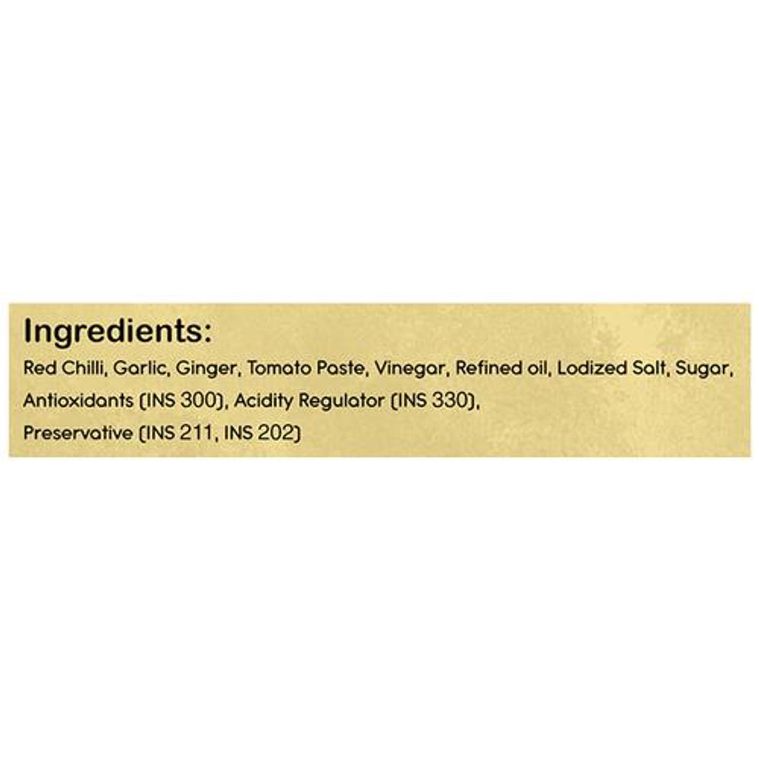 Red Chilli, Garlic, Ginger, Tomato Paste, Vinegar, Refined oil, Iodized Salt, Sugar, Antioxidants (INS 300), Acidity Regulator (INS 330), Preservative (INS 211, INS 202)