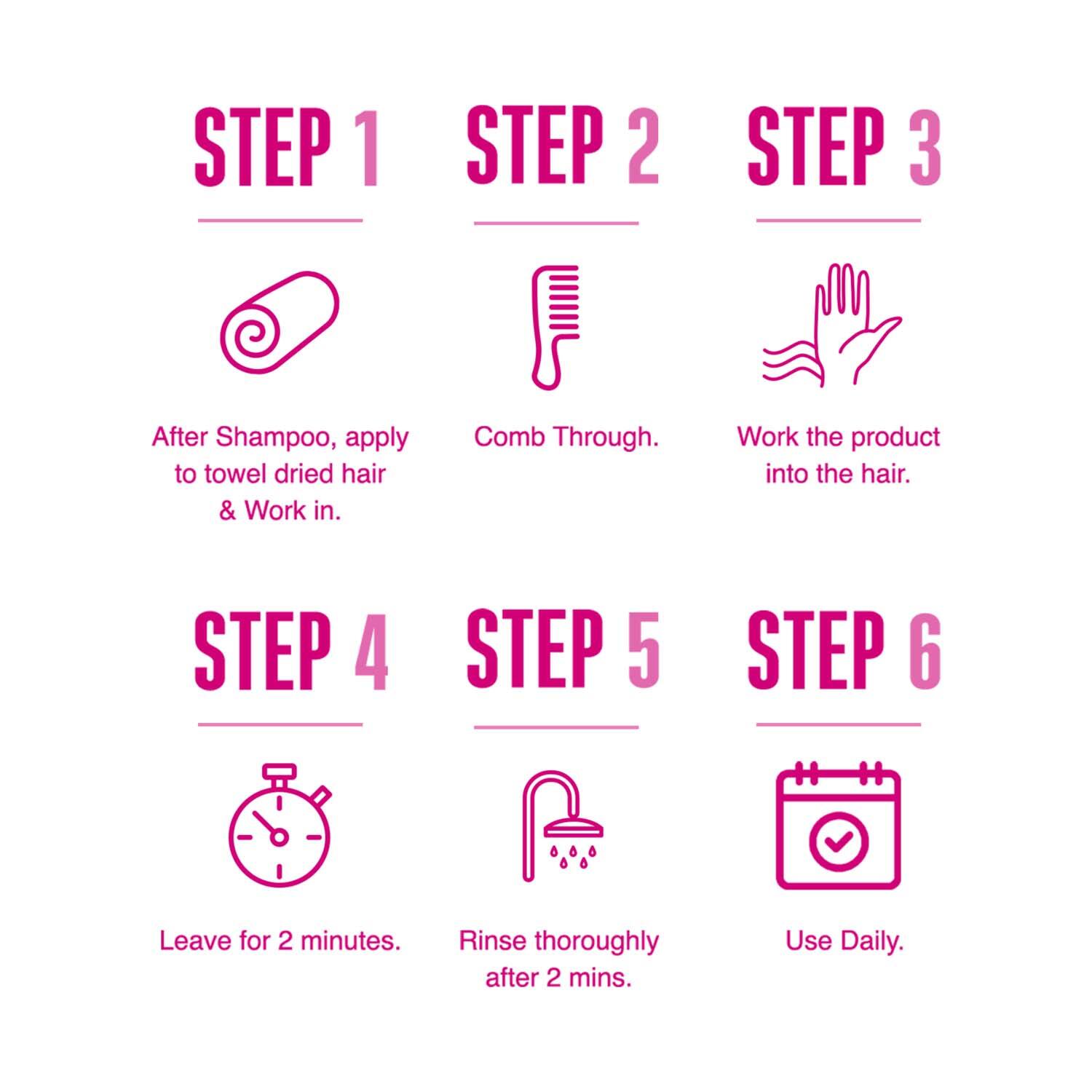 How to Use:Shampoo your hair and towel dry it. Take a necessary amount of the conditioner and work it into the strands. Leave it in your hair for 2 minutes, then rinse it off thoroughly.