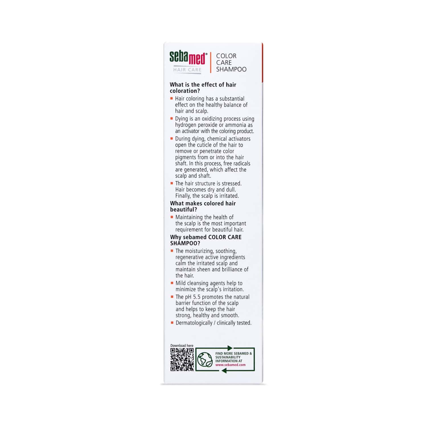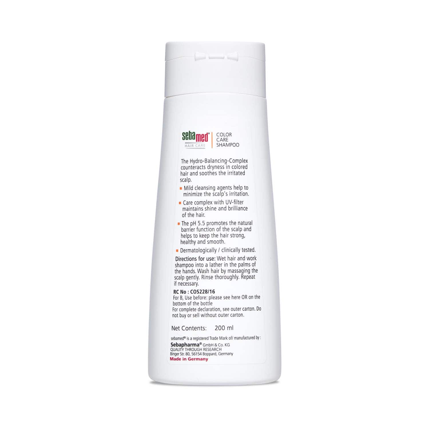Pamper your hair with the Sebamed Color Care Shampoo (200 ml). Formulated with a hydro-balancing complex, this hydrating shampoo calms irritated scalp and keeps your hair healthy. With a pH of 5.5, it is a color protect shampoo that maintains your hair's natural barrier function and prevents color fading. This Sebamed shampoo contains UV filters and protects your hair against UV damage.Key Features & Benefits:Contains a hydro-balancing complex to calm irritated scalpHas a pH of 5.5 to maintain natural barrier function and strengthen the hair cuticleUV filters prevent hair color from fading and protect the hair from UV damageDermatologically tested to maintain color brilliance and rejuvenate stressed hairAll Ingredients:Aqua, Cocamidopropyl Betaine, Sodium Laureth Sulfate, Sodium Lauroyl Sarcosinate, Coco-Glucoside, Glyceryl Oleate, Hydroxypropyl Oxidized Starch Pg-Trimonium Chloride, Starch Hydroxypropyltrimonium Chloride, Isoamyl P-Methoxycinnamate, Urea, Hydrolyzed Wheat Protein, Polyquaternium-67, Propylene Glycol, Peg-4 Distearyl Ether, Distearyl Ether, Dicaprylyl Ether, Peg-55 Propylene Glycol Oleate, Citric Acid, Parfum, Phenoxyethanol, Sodium Benzoate.How to Use:Wet your hair. Take a sufficient amount of the shampoo in your palm and apply it to your hair. Massage the product into your hair to create a lather, then wash it off thoroughly. Repeat the process if required.About the Brand:Sebamed is a German skincare brand founded by Dr. Heinz Maurer in the year 1957. Their range of products includes serums, cleansers, face creams, Baby skincare products, and much more. The brand develops gentle and efficient skincare products with a pH of 5.5 to maintain the skin's natural barrier. Sebamed products are clinically tested and are safe to use on sensitive skin types.Check out more Sebamed Shampoo options here, or browse through tokocart's full range of Shampoo from top global brands.You can also explore other products from the world of Sebamed here on tokocart.