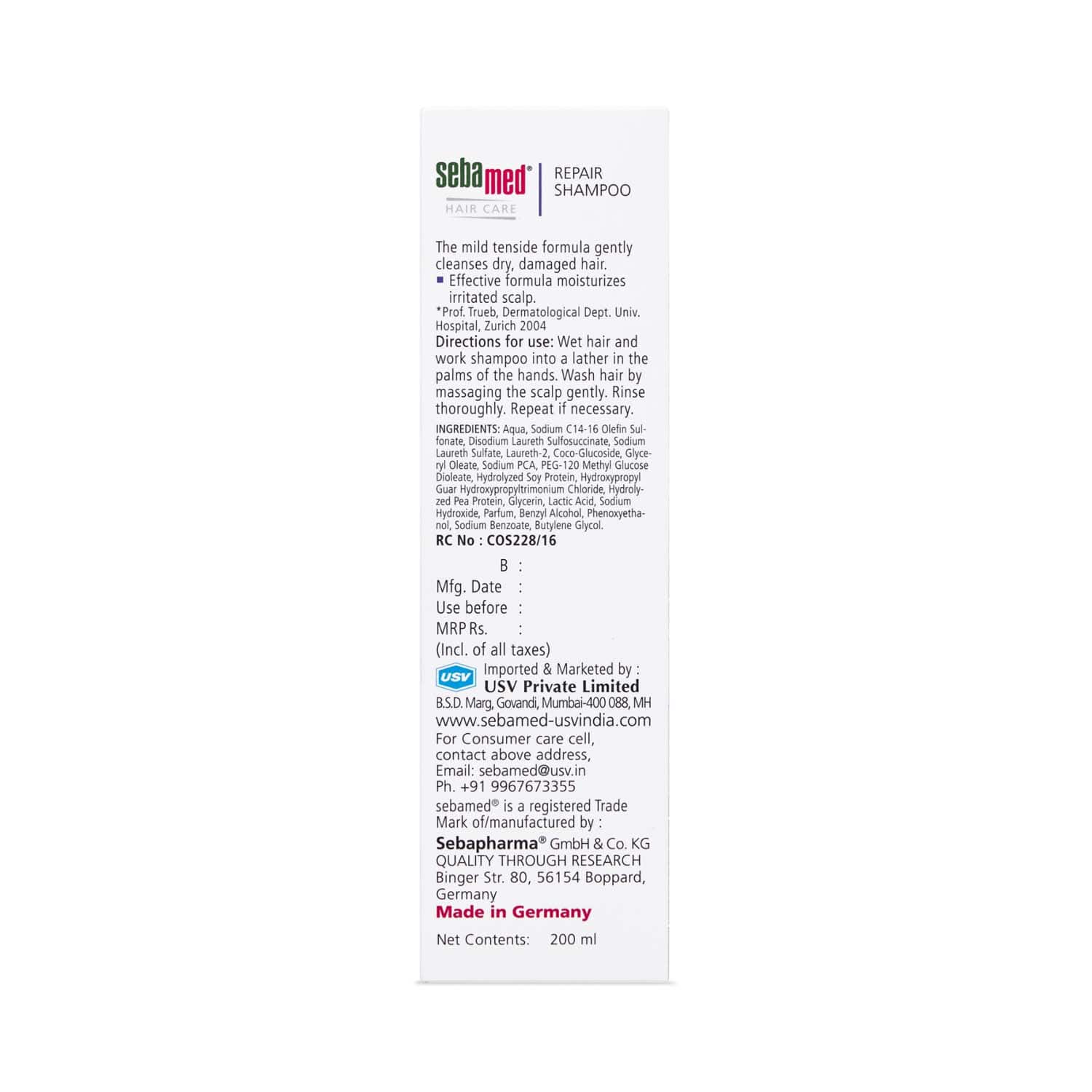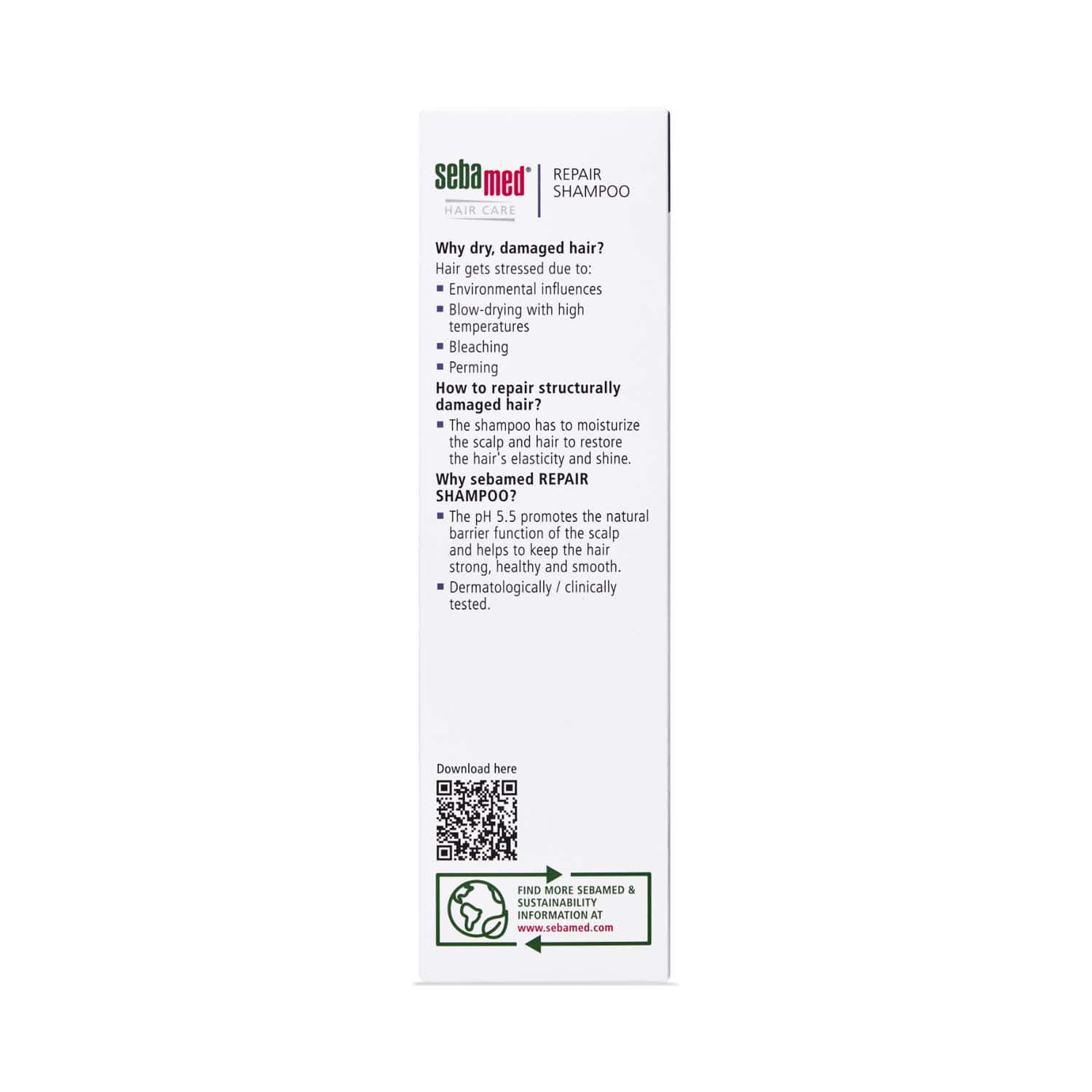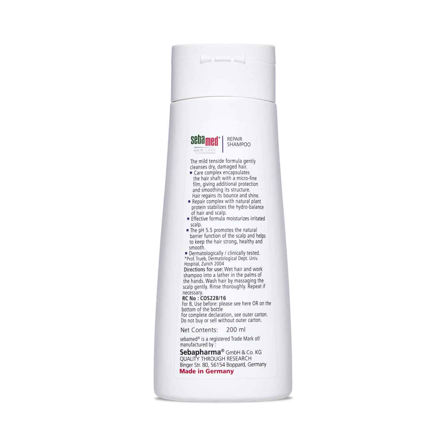 Add the power of the Sebamed Hair Repair Shampoo (200 ml) to your routine. Enriched with plant protein, this nourishing shampoo maintains your hair's hydro-balance. With a pH of 5.5, it is a hair-strengthening shampoo that fortifies the hair cuticles, restores elasticity, and reduces breakage. Plus, this Sebamed shampoo keeps your hair healthy while giving it a glossy shine.Key Features & Benefits:Infused with a plant protein to maintain the hydro-balance of the hairHas a pH of 5.5 to maintain natural barrier function and strengthen the hair cuticleRestores hair elasticity to smoothen, reduce breakage, and restore shineDermatologically tested to revive dry, damaged hairAll Ingredients:Aqua, Sodium C14-16 Olefin Sulfonate, Disodium Laureth Sulfosuccinate, Sodium Laureth Sulfate, Laureth-2, Coco-Glucoside, Glyceryl Oleate, Sodium Pca, Peg-120 Methyl Glucose Dioleate, Hydrolyzed Soy Protein, Hydroxypropyl Guar Hydroxypropyltrimonium Chloride, Hydrolyzed Pea Protein, Glycerin, Lactic Acid, Sodium Hydroxide, Parfum, Benzyl Alcohol, Phenoxyethanol, Sodium Benzoate, Butylene GlycolHow to Use:Wet your hair. Take a sufficient amount of the shampoo in your palm and apply it to your hair. Massage the product into your hair to create a lather, then wash it off thoroughly. Repeat the process if required.About the Brand:Sebamed is a German skincare brand founded by Dr. Heinz Maurer in the year 1957. Their range of products includes serums, cleansers, face creams, Baby skincare products, and much more. The brand develops gentle and efficient skincare products with a pH of 5.5 to maintain the skin's natural barrier. Sebamed products are clinically tested and are safe to use on sensitive skin types.Check out more Sebamed Shampoo options here, or browse through tokocart's full range of Shampoo from top global brands.You can also explore other products from the world of Sebamed here on tokocart.