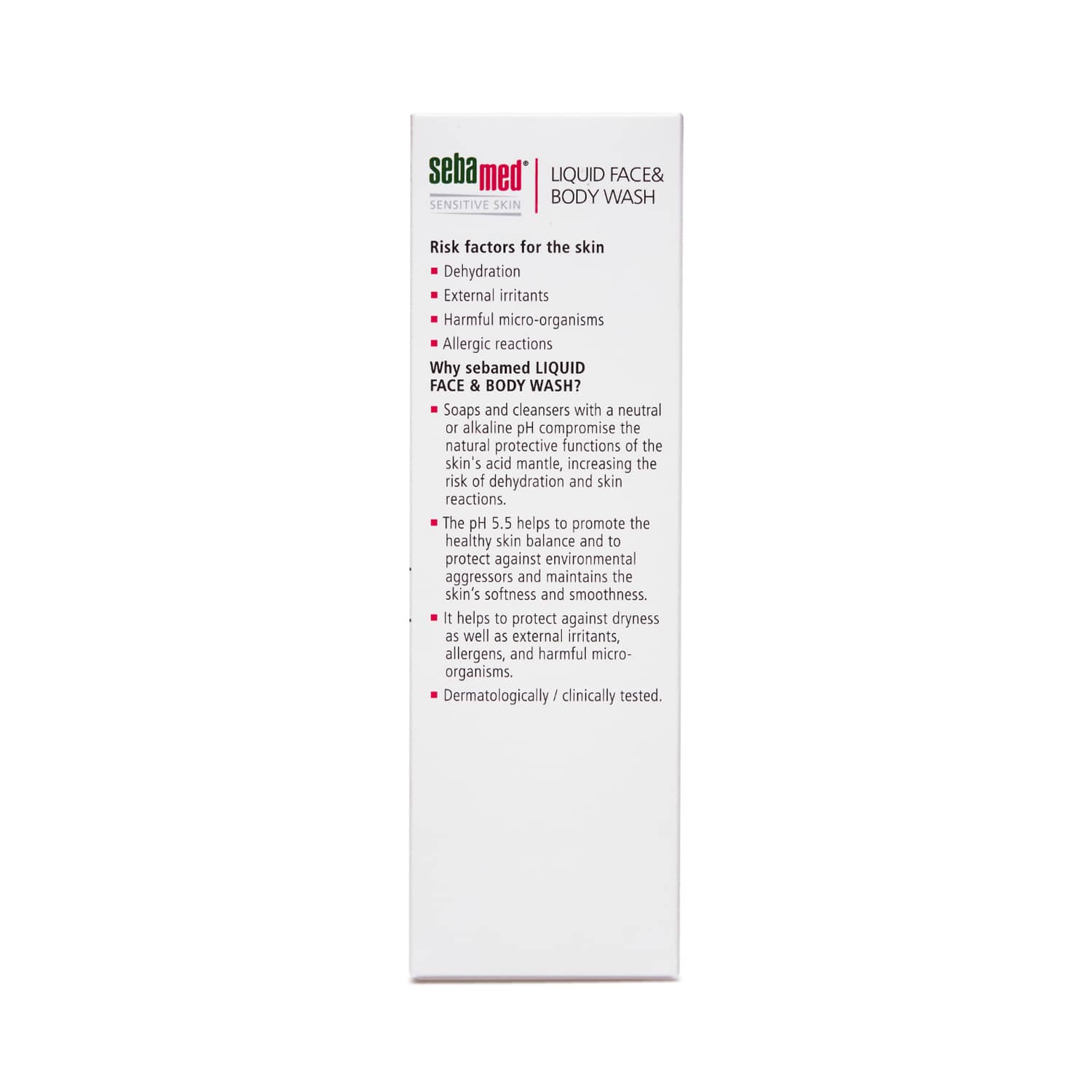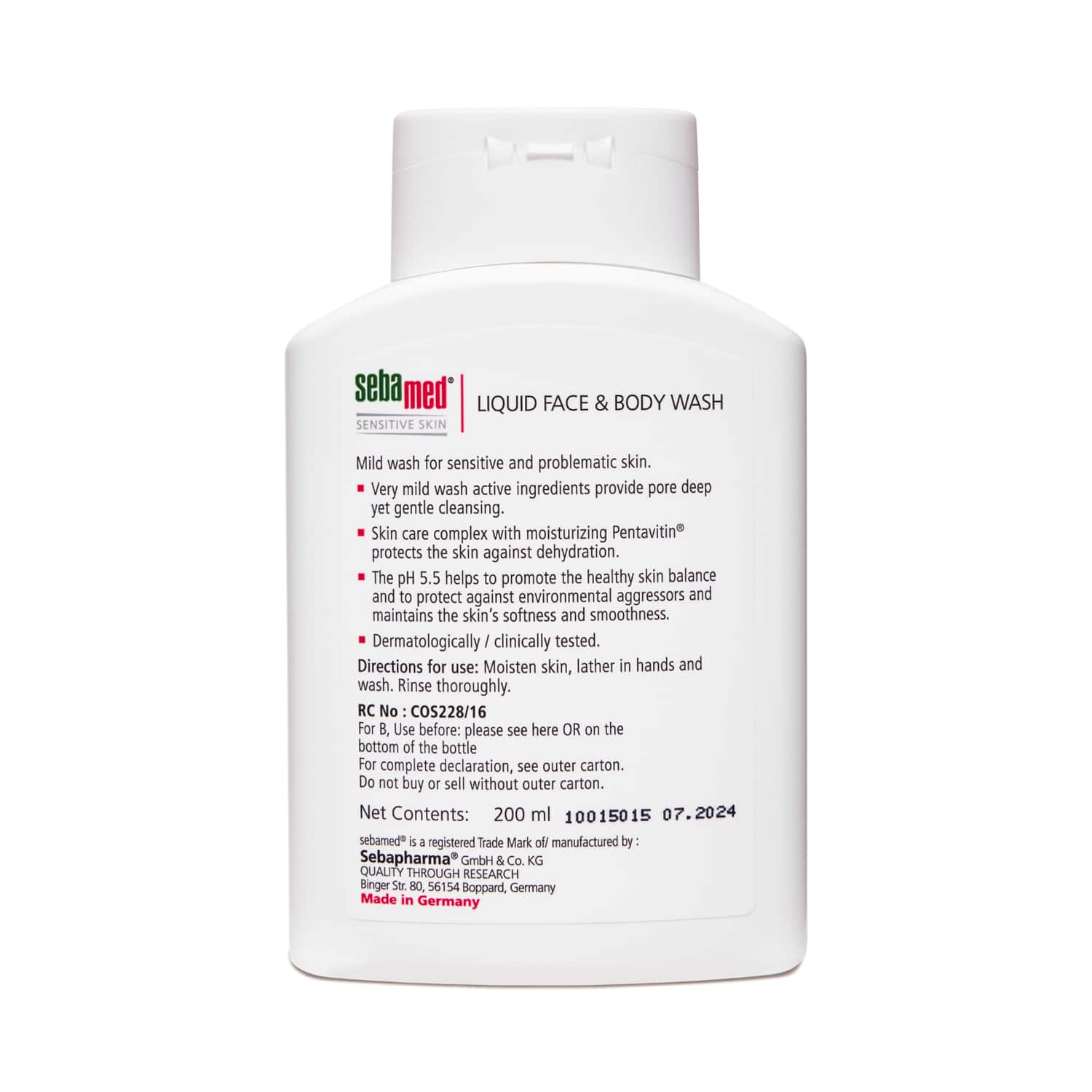 The Sebamed Liquid Face & Body Wash (200ml) leaves you feeling refreshed after a long day. This cleansing face and body wash clears impurities from within the pores and leaves your skin feeling smooth. Also, the Sebamed face and body wash contains vitamins and allantoin to keep your skin healthy, while the absence of harmful chemicals keeps it safe.Key Features & Benefits:Deeply moisturizes the skin to prevent drynessFormulated without soap and alkali to prevent drynessFree from parabens, paraffin, propylene glycol, and phthalates for safe useFormulated to suit very sensitive and allergy-prone skinKey Ingredients:Allantoin: Smoothens the skinAll Ingredients:Water (Aqua), Sodium Laureth Sulfate, Sodium C14-16 Olefin Sulfonate, Disodium Laureth Sulfosuccinate, Sodium Chloride, Laureth-2, Panthenol (Vitamin B5), Glycol Distearate, Fragrance (Parfum), Saccharide Isomerate, Allantoin, Niacinamide (Vitamin B3), Pyridoxine Hci (Vitamin B6), Glycine, Magnesium Aspartate, Alanine, Lysine, Leucine, Biotin (Vitamin H), Glycerin, Sodium Lauroyl Glutamate, Sodium Citrate, Cocamidopropyl Betaine, Sorbitan Laurate, Peg-120 Methyl Glucose Dioleate, Phenoxyethanol, Potassium Sorbate, Sodium Benzoate, Yellow 10 (Ci 47005), Blue 1 (Ci 42090)How to Use:Take a quarter-sized amount of body wash in your palms. Apply it to wet face and skin, and lather it up. Then wash it off with water and pat dry.About the Brand:Sebamed is a German skincare brand founded by Dr. Heinz Maurer in the year 1957. Their range of products includes serums, cleanses, face creams, Baby skincare products, and much more. The brand develops gentle and efficient skincare products with a pH of 5.5 to maintain the skin's natural barrier. Sebamed products are clinically tested and are safe to use on sensitive skin types.Check out more Sebamed Body Wash & Shower Gel options here, or browse through tokocart's full range of Body Wash & Shower Gel from top global brands.You can also explore other products from the world of Sebamed here on tokocart.