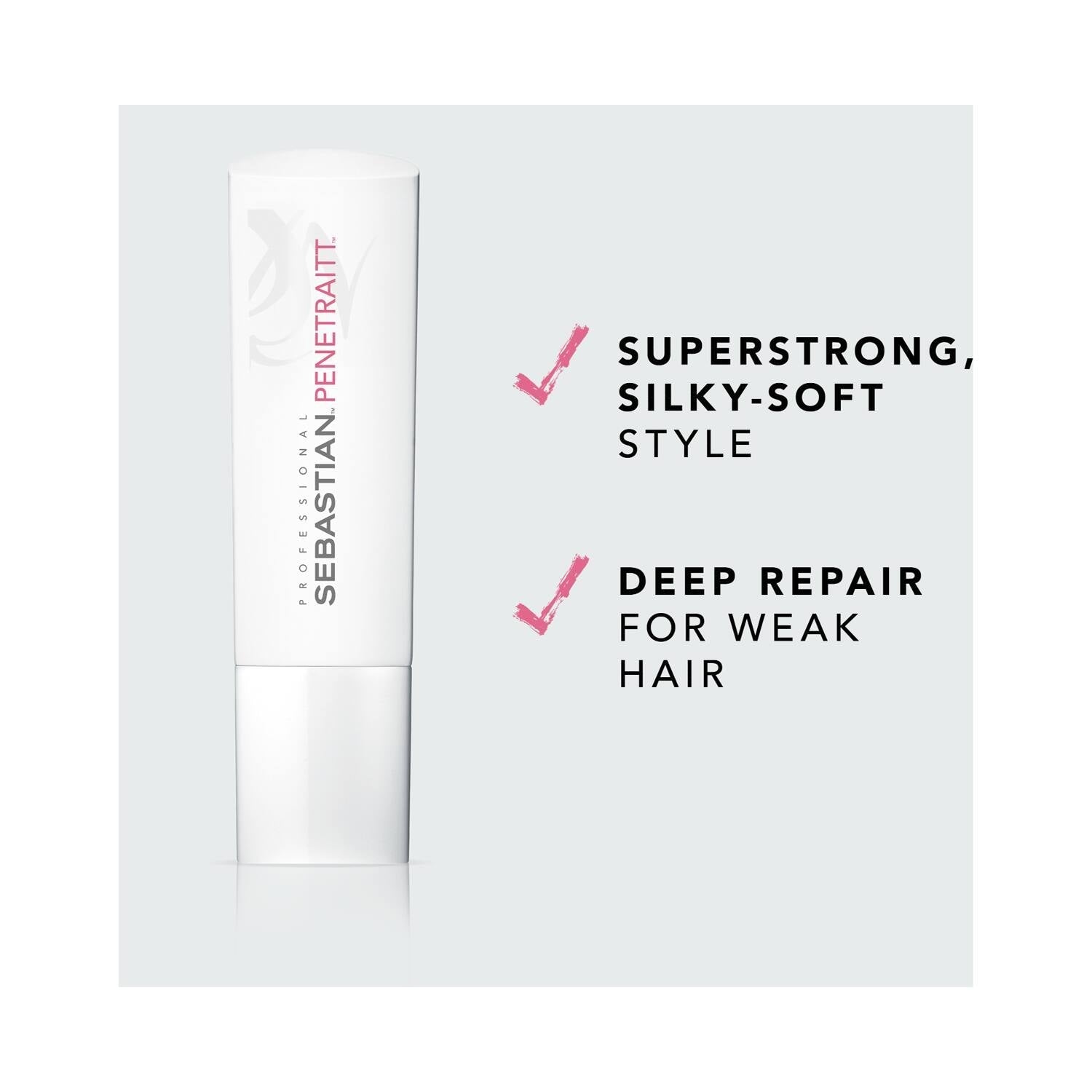 The Sebastian Professional Penetraitt Conditioner For Strengthening & Repair (250ml) helps restore your hair's strength and shine. With its deeply moisturizing formula, this hydrating conditioner is specially designed for dry, color-treated hair. Also, the Sebastian Professional hair conditioner helps eliminate frizz and makes your hair shine like never before.Key Features & Benefits:Deeply moisturizes to soften the hairConditioning formula helps detangle the hairHelps to strengthen and repair damaged hairSpecially formulated for dry, color-treated hairAll Ingredients:Water, Stearyl Alcohol, Behentrimonium Chloride, Cetearyl Alcohol, Bis Aminopropyl Dimethicone, Benzyl Alcohol, Phenoxyethanol, Fragrance (Parfum), Methylparaben, Propylparaben, Disodium Edta, Hydrolyzed Silk, Simmondsia Chinensis (Jojoba) Seed Oil, Oryza Sativa (Rice) Bran Oil.How to Use:After washing with shampoo, apply conditioner to your hair, focusing first on the lower ends of your hair and working your way upwards. Wait for a minute and rinse it out.About the Brand:Sebastian Professional is a hair care brand founded by Geri Cusenza and John Sebastian in the year 1973. The brand aims to simplify and solve the challenges that hairdressers face every day. Their range of products includes hair shampoos, conditioners, hair masks, hair oils, and much more. They create innovative products with high-quality ingredients to soothe every hair type and also enable the user to create any hairstyle.Check out more Sebastian Professional Conditioner options here, or browse through tokocart's full range of Conditioner from top global brands.You can also explore other products from the world of Sebastian Professional here on tokocart.
