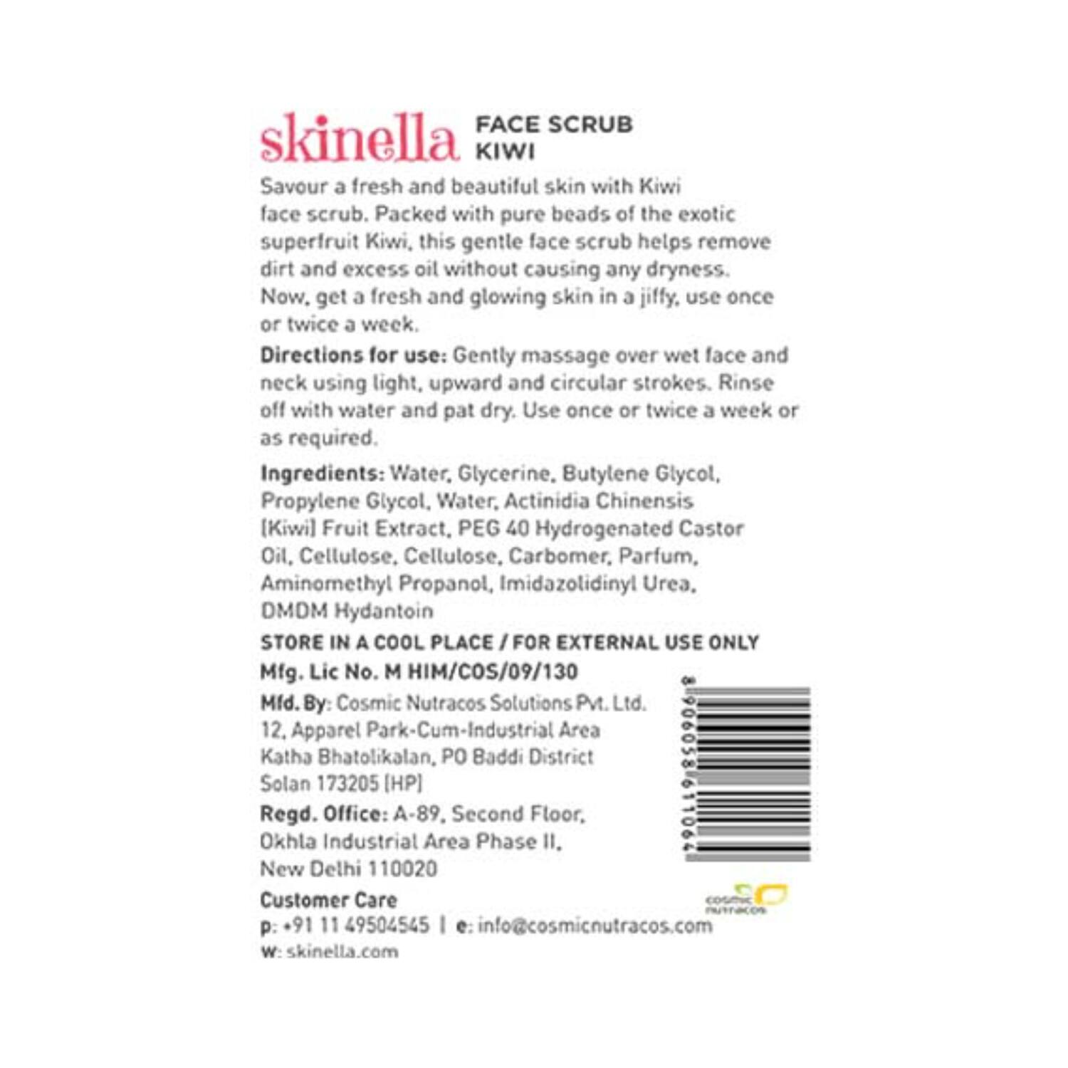 Savor fresh and beautiful skin with Skinella’s Kiwi Face Scrub. Packed with exotic and pure crushed Kiwi beads, this gentle face scrub helps remove dirt and excess oil without causing any dryness. Kiwi, a nutrient-dense and anti-oxidant rich superfood, provides many skin benefits and helps in deep exfoliation.Key Features & Benefits:Soften your skinFeels freshMoisturize your skinClean your pour of skinAll Ingredients: Water, Glycerine, Butylene Glycol, Propylene Glycol, Water, Actinidia Chinensis Kiwi) Fruit Extract, PEG 40 Hydrogenated Castor Oil, Cellulose, Cellulose, Carbomer, Parfum About the Brand:Skinella. A range of skincare products that are made with the natural power of super-foods so that you can feed your skin pure beauty without the baggage of chemicals. We understand what your young skin needs. Freshness! That’s why our exotic formulation of fresh fruits and superfoods is here to keep you looking #SuperNaturally