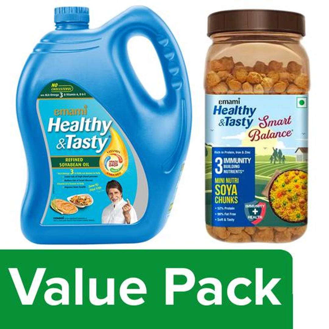 Emami Healthy & Tasty Soyabean Oil is manufactured with Multistage European Refining Technology for highest purity & retention of natural nutrients. It is a light, odourless, and healthy oil. It helps to maintain a healthy heart, control the cholesterol level, improves vision, promotes healthy skin, and eyes, and boosts your immune system. "