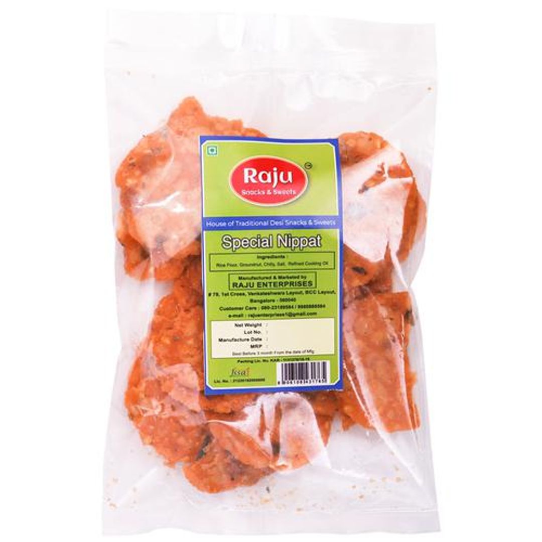 Raju Snacks Special Nippat is a delicious and healthy snack for everyone. It has a delightful taste and wonderful aroma. It gives you a healthy snack option that does not compromise on the taste. It has a crunchy texture. Explore more such delicious snacks available at Big Basket.