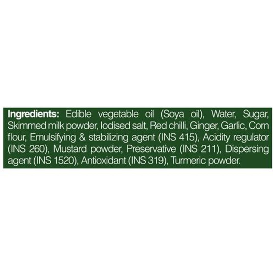 Soya Oil, Water, Sugar, Skimmed Milk Powder, Iodised Salt, Red Chilli, Ginger, Garlic, Cornflour, Emulsifying & Stabilizing Agent (ins 415), Acidity Regulator (ins260), Mustard Powder, Preservative (ins 211), Dispersing Agent (ins 1520), Antioxidant (ins 319), Turmeric Powder. Contains Permitted Class Ii Preservative (ins 211).