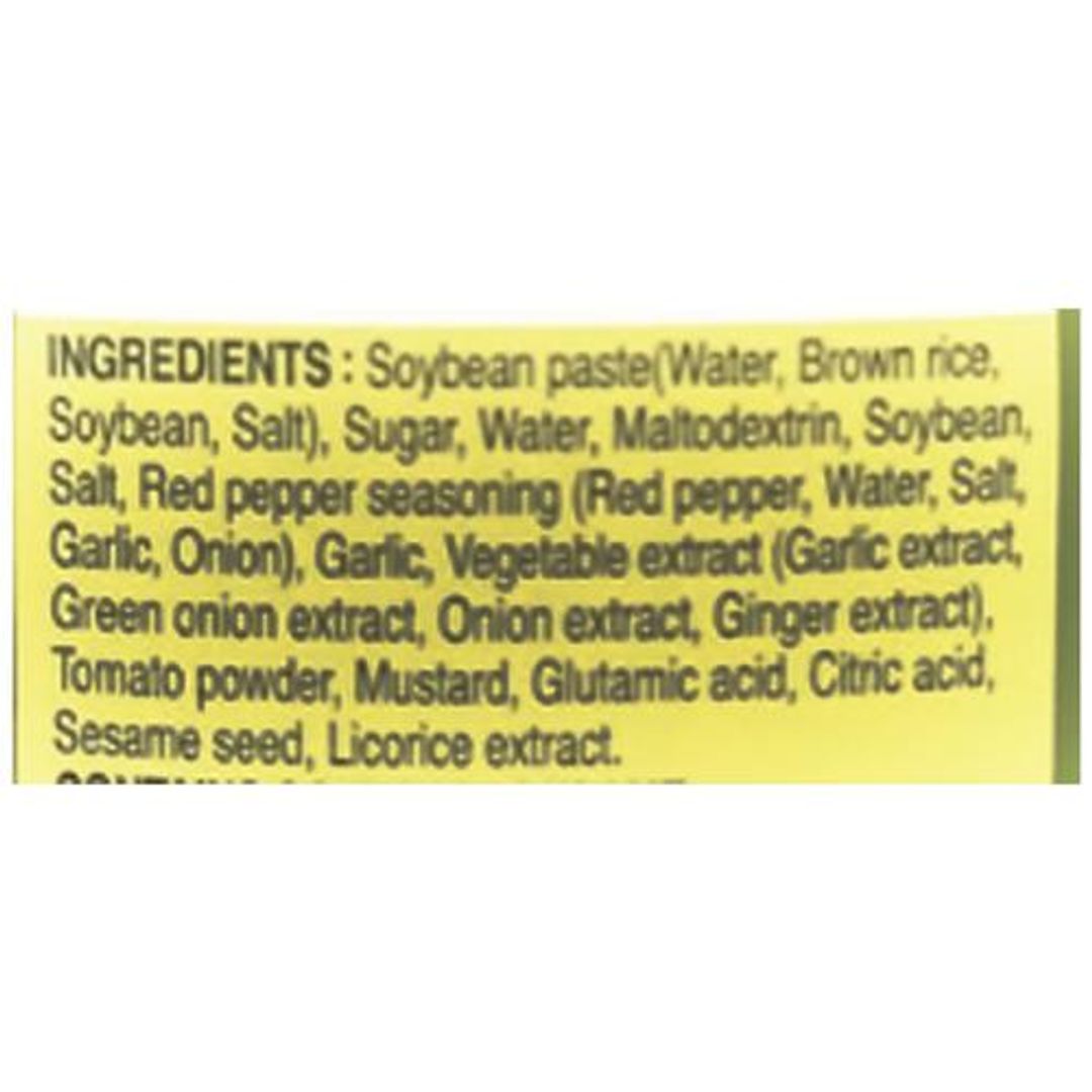 Soybean Paste, Sugar, Water, Maltodextrin, Soybean, Salt, Red Pepper Seasoning, Garlic Extract, Green Onion Extract, Onion Extract, Ginger Extract, Tomato Powder, Mustard, Glutamic Acid, Citric Acid, Sesame Seed, Licorice Extract